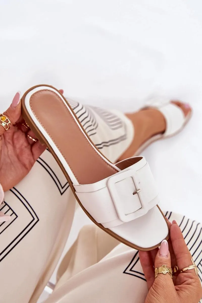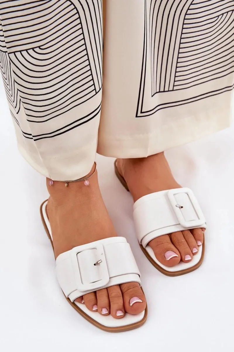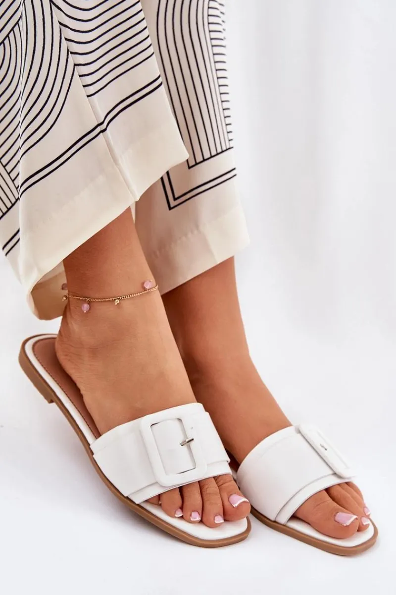 Hot Boto Płaskie Klapki Damskie Eko Skórzane Z Klamrą Białe Bamma