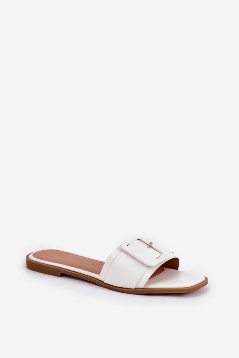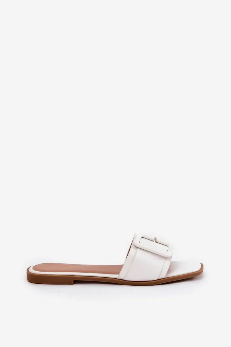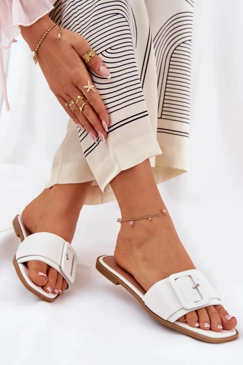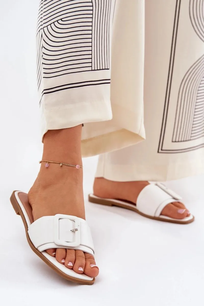 Hot Boto Płaskie Klapki Damskie Eko Skórzane Z Klamrą Białe Bamma