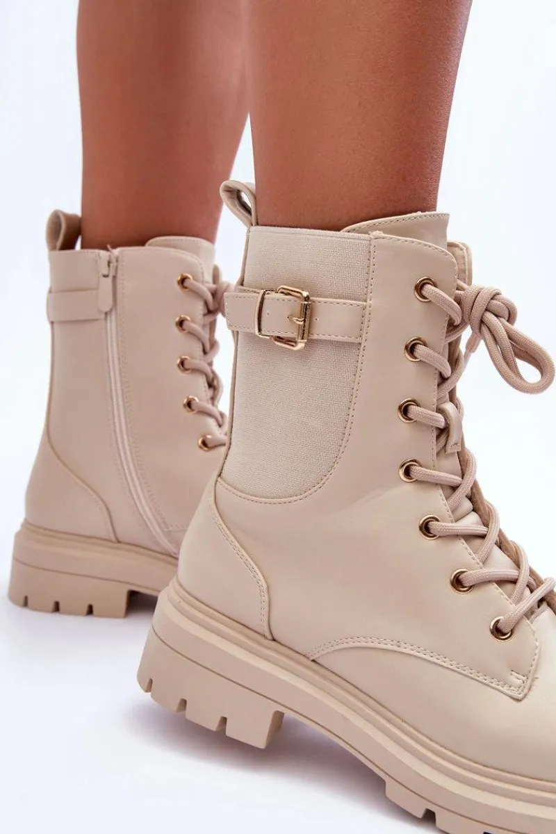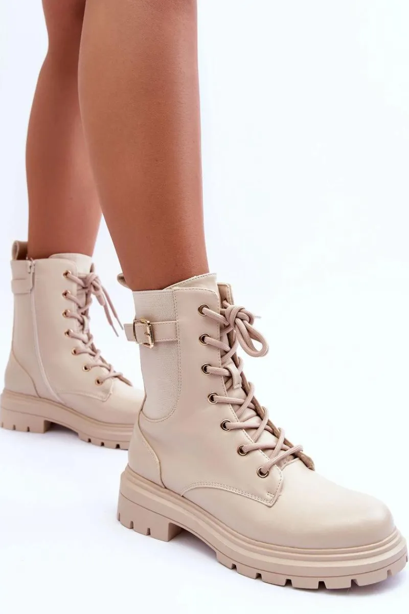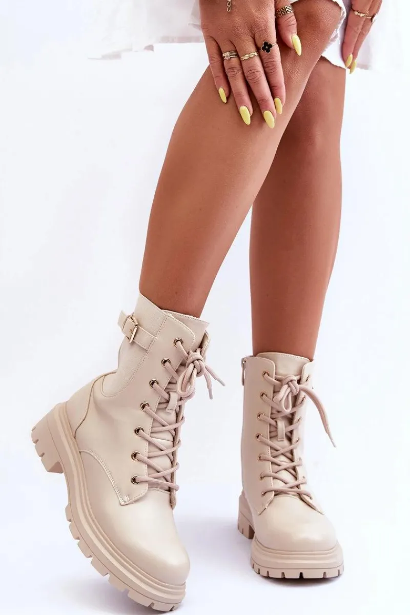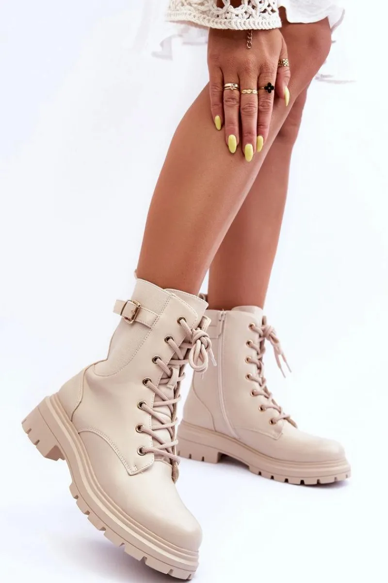 Modne botki wykonane z eko skóry. Osadzone na płaskim obcasie i platformie. Zapinane są z boku cholewki na zamek oraz dodatkowo sznurowane. Model ten posiada ozdobę w postaci paska ze sprzączką. Zapiętek w tym obuwiu jest usztywniany. Świetny model do jesiennych i zimowych stylizacji! Przy wyborze rozmiaru prosimy sugerować się tabelą rozmiarów.