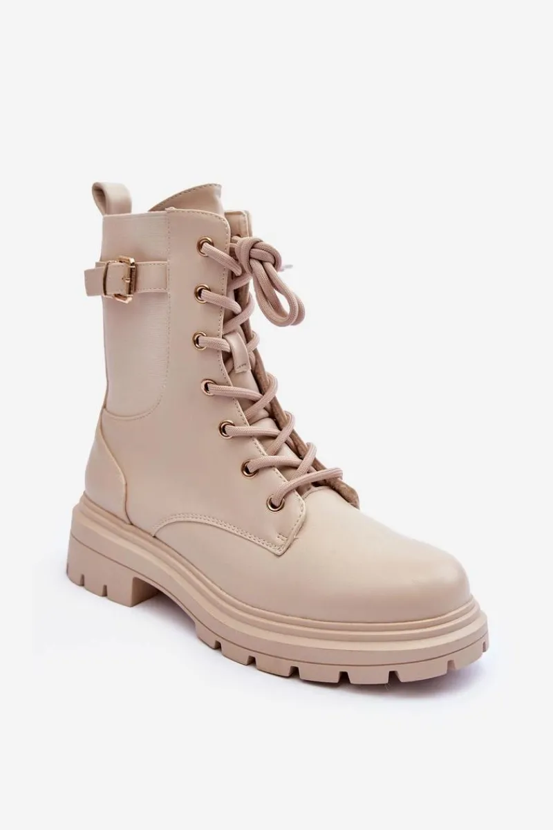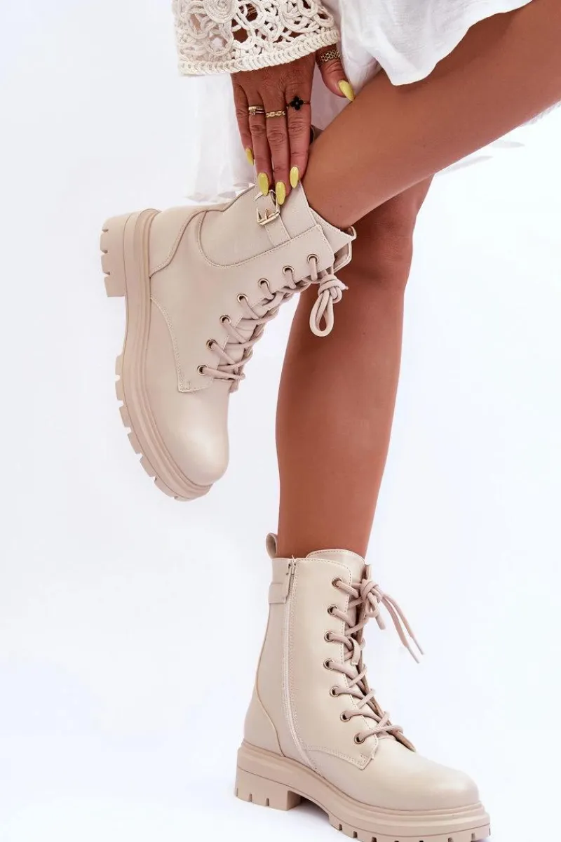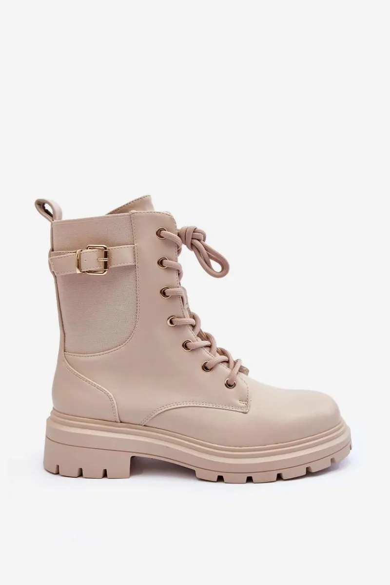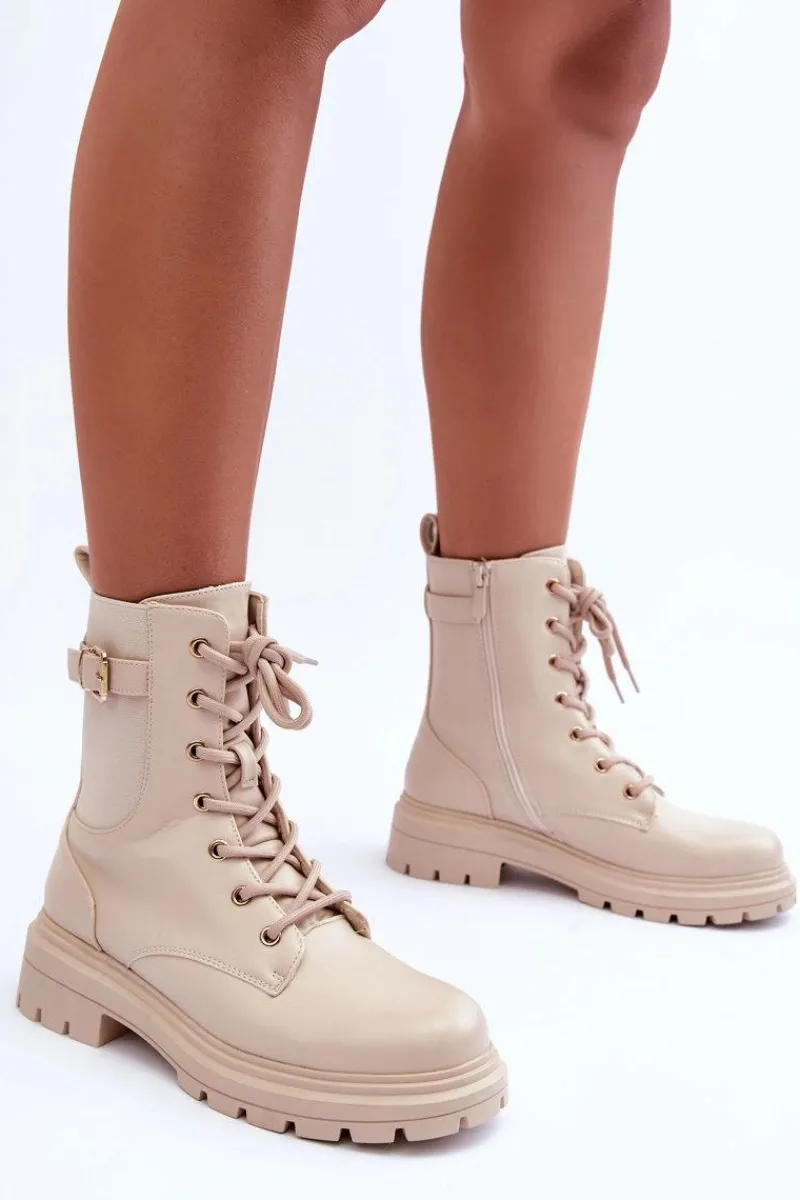 Modne botki wykonane z eko skóry. Osadzone na płaskim obcasie i platformie. Zapinane są z boku cholewki na zamek oraz dodatkowo sznurowane. Model ten posiada ozdobę w postaci paska ze sprzączką. Zapiętek w tym obuwiu jest usztywniany. Świetny model do jesiennych i zimowych stylizacji! Przy wyborze rozmiaru prosimy sugerować się tabelą rozmiarów.