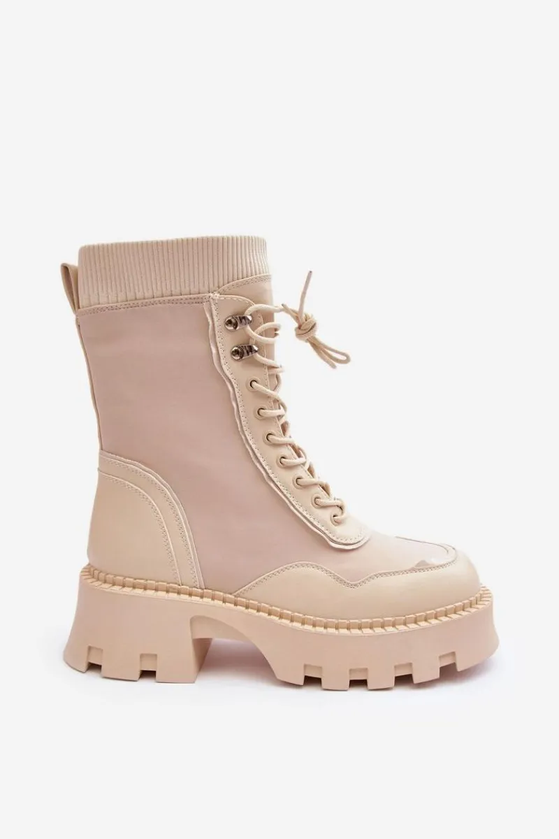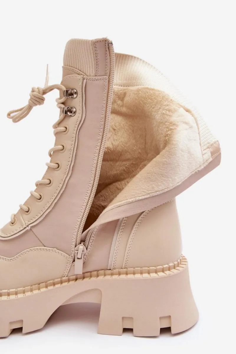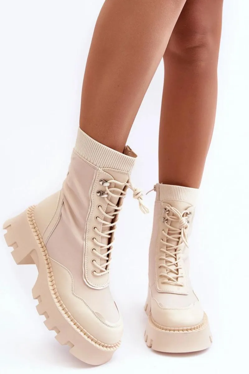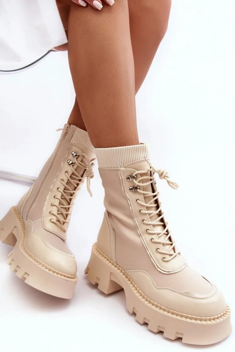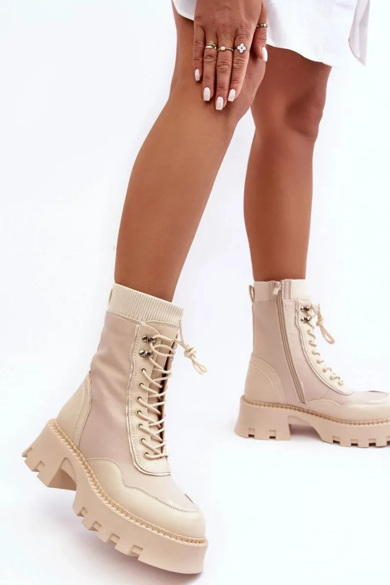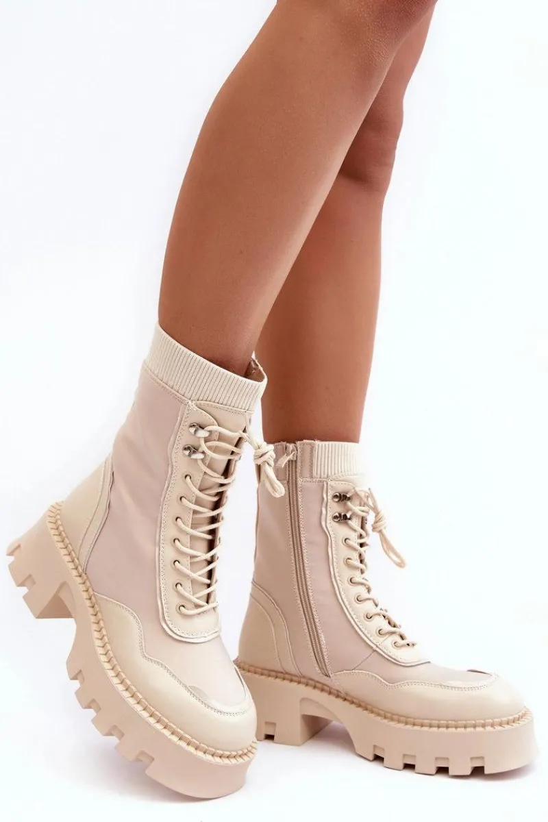 Workery damskie osadzone na masywnym, płaskim obcasie oraz platformie. Wykonane z połączenia eko skóry i materiału tekstylnego. Z przodu sznurowane oraz dodatkowo zapinane na suwak po wewnętrznej stronie cholewki. Noski zaokrąglone. Środek ocieplony kocem obuwniczym. Sprawdź całą naszą kolekcję wysokich botków! Przy wyborze rozmiaru prosimy sugerować się tabelą rozmiarów.