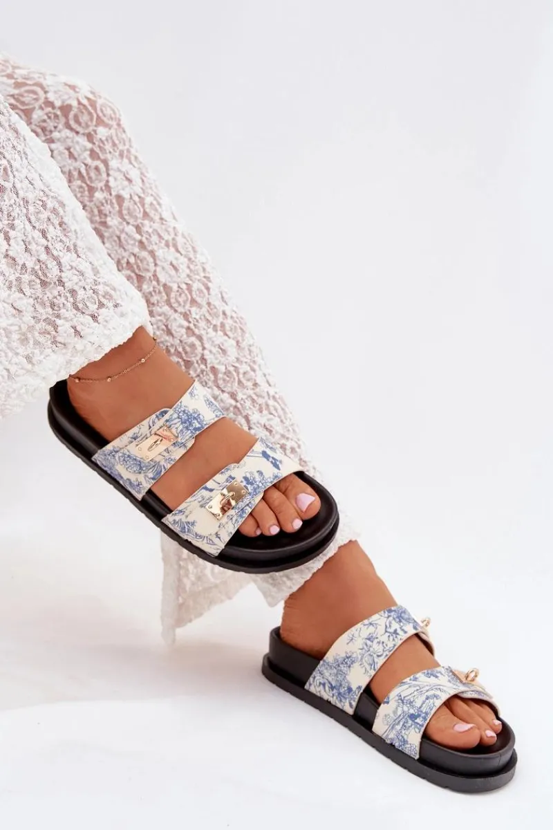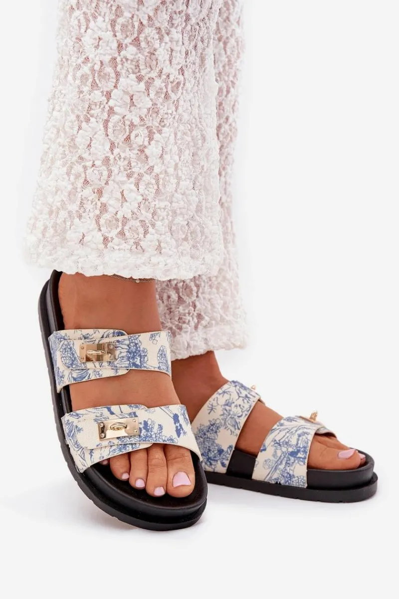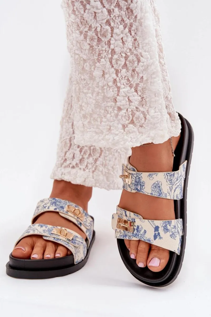 Wzorzyste klapki damskie wykonane z materiału tekstylnego, osadzone na platformie, to stylowa propozycja na letnie dni. Model wyróżnia się dwoma paskami ozdobionymi złotymi elementami, które dodają im wyjątkowego charakteru. Idealne do codziennych stylizacji, świetnie komponują się z sukienkami, spódnicami czy szortami, zapewniając modny wygląd. Przy wyborze rozmiaru prosimy sugerować się tabelą rozmiarów.