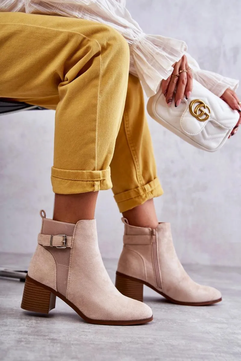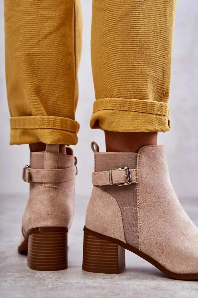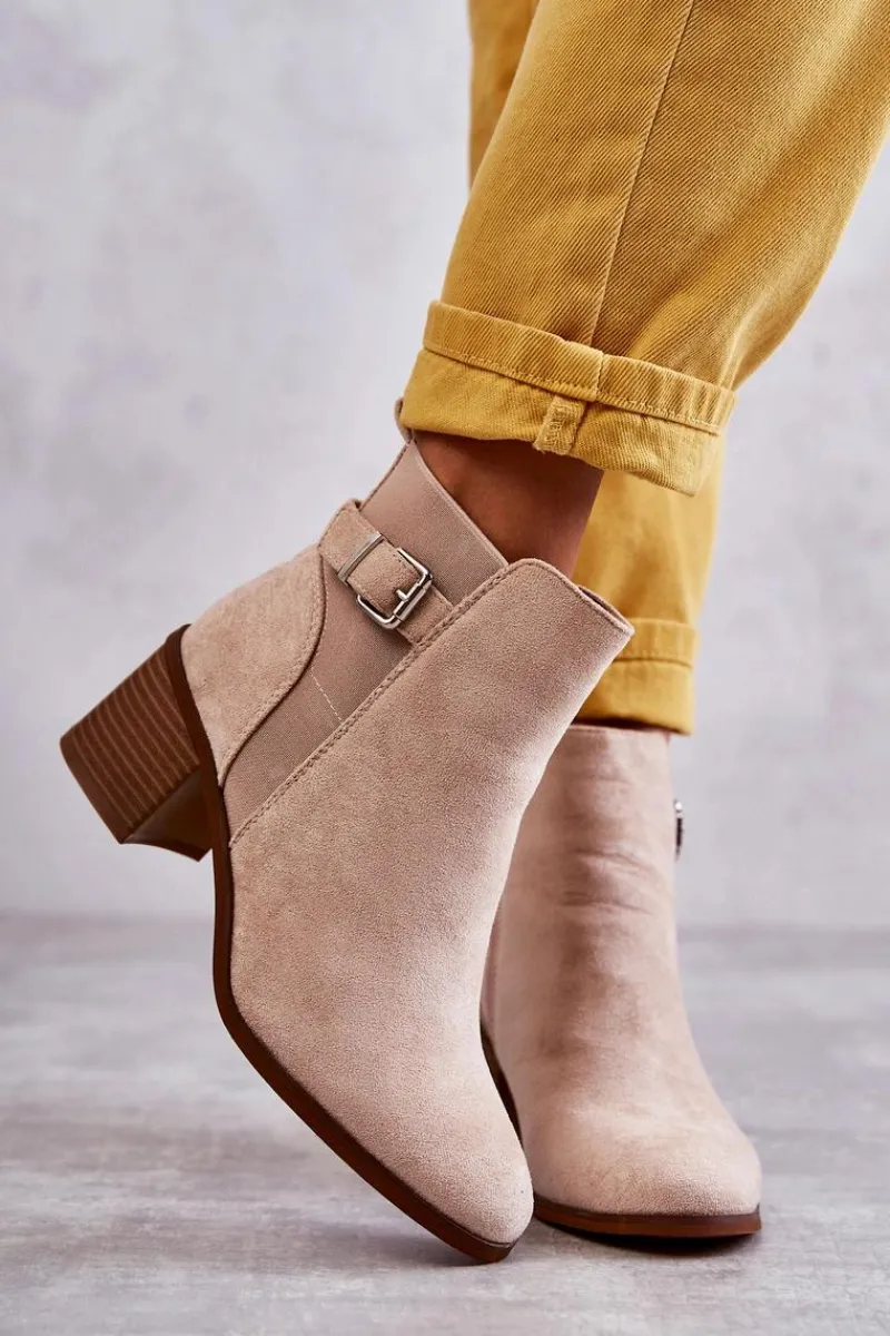 Botki wykonane z eko zamszu. Wnętrze zostało ocieplone miłym w dotyku kocem obuwniczym. Z boku cholewki znajduje się także pasek zapinany na sprzączkę. Obcas w postaci masywnego słupka. Modny fason sprawia, że możesz założyć je do wielu stylizacji. Nosek zaokrąglony. Buty posiadają także usztywniany zapiętek. W tych botkach jesienne dni nie będą już takie straszne! Przy wyborze rozmiaru prosimy sugerować się tabelą rozmiarów.