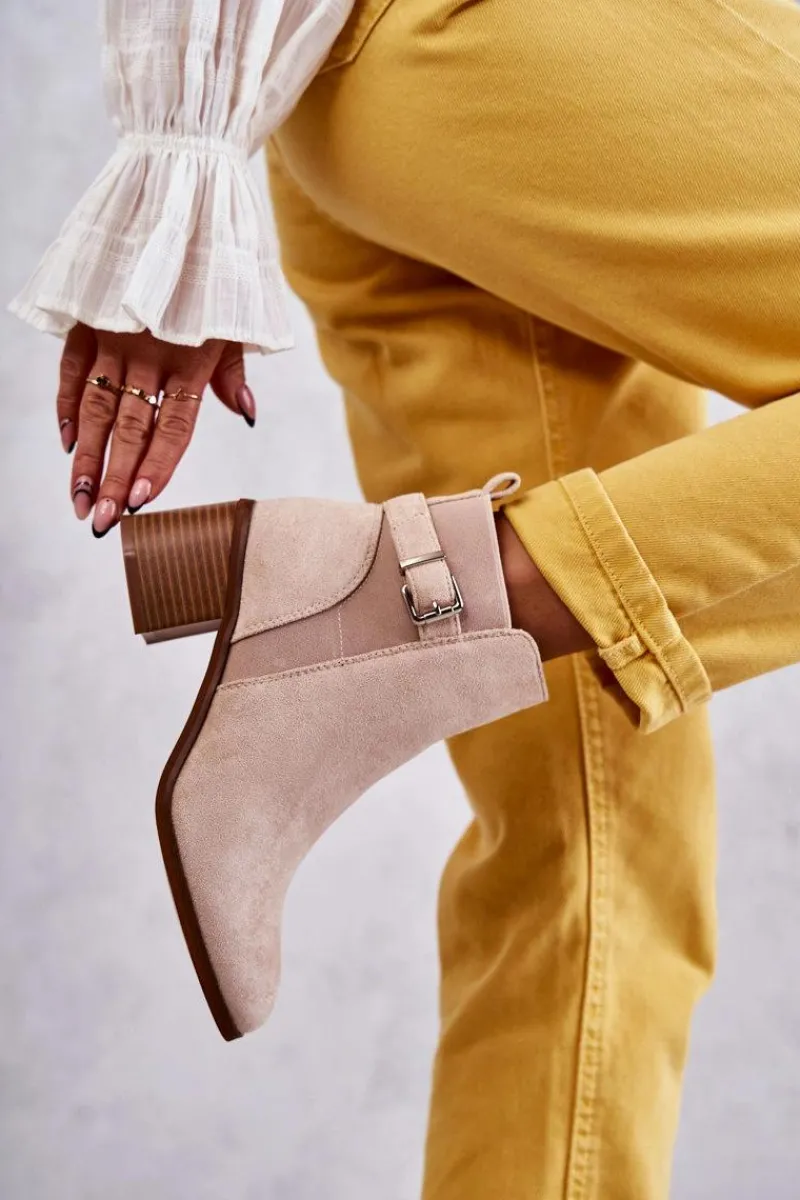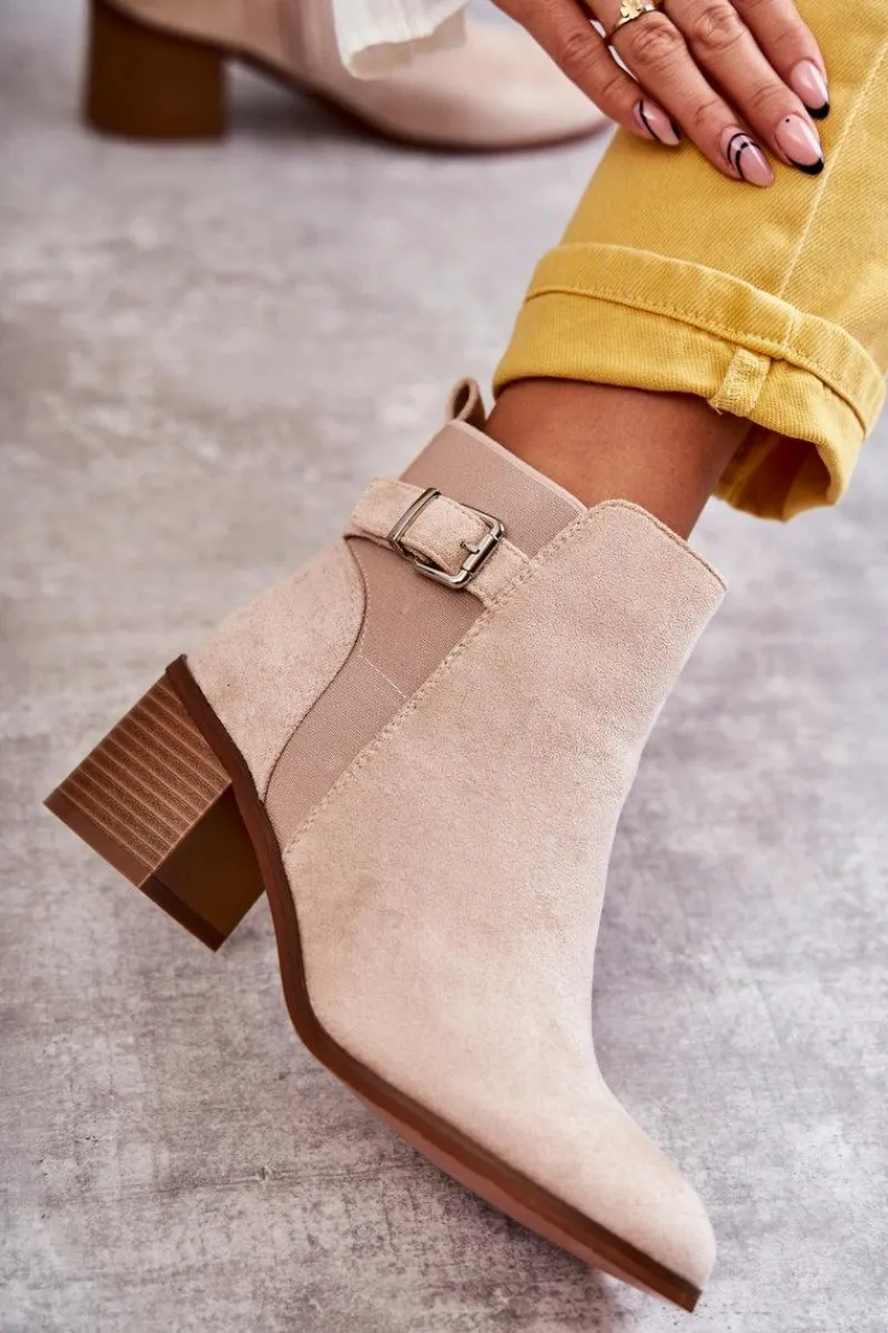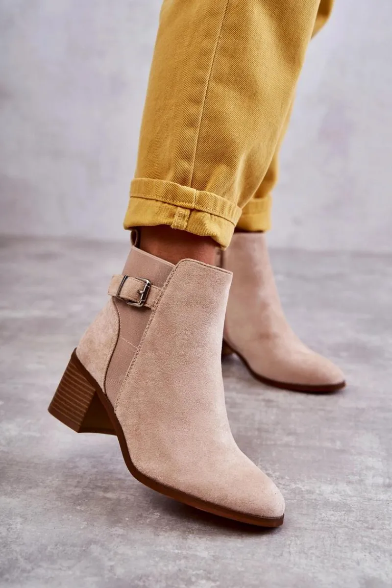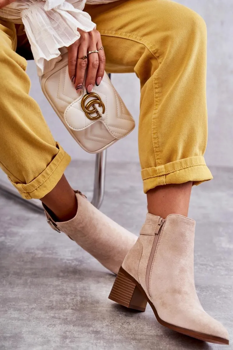 Botki wykonane z eko zamszu. Wnętrze zostało ocieplone miłym w dotyku kocem obuwniczym. Z boku cholewki znajduje się także pasek zapinany na sprzączkę. Obcas w postaci masywnego słupka. Modny fason sprawia, że możesz założyć je do wielu stylizacji. Nosek zaokrąglony. Buty posiadają także usztywniany zapiętek. W tych botkach jesienne dni nie będą już takie straszne! Przy wyborze rozmiaru prosimy sugerować się tabelą rozmiarów.