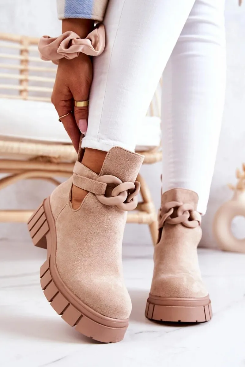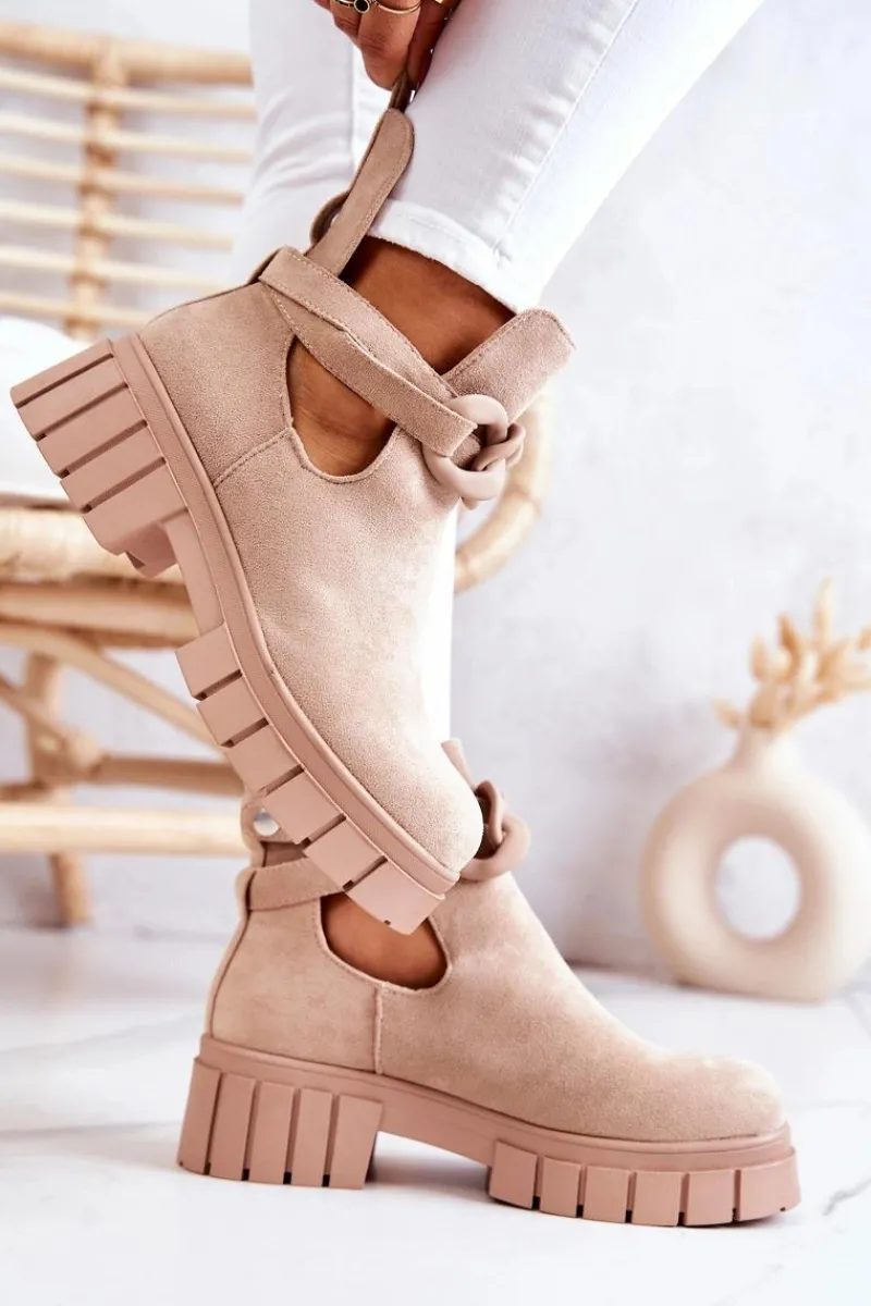 Botki z wycięciem z pewnością podkreślą Twój styl! Wykonane zostały z eko zamszu. Idealne na sezon wiosenno-letni! Model wsuwany. Botki będą pasować do wielu stylizacji. Płaski obcas i masywna podeszwa świetnie będą izolować od zimnego, nierównego podłoża. Pasek z ozdobnym łańcuchem jest zapinany na napę i można go zdjąć. Sprawdź także inne modele botków! Przy wyborze rozmiaru prosimy sugerować się tabelą rozmiarów.