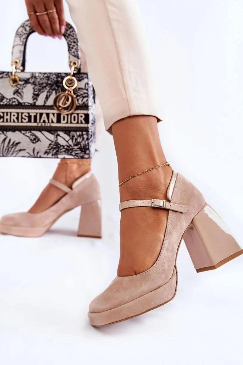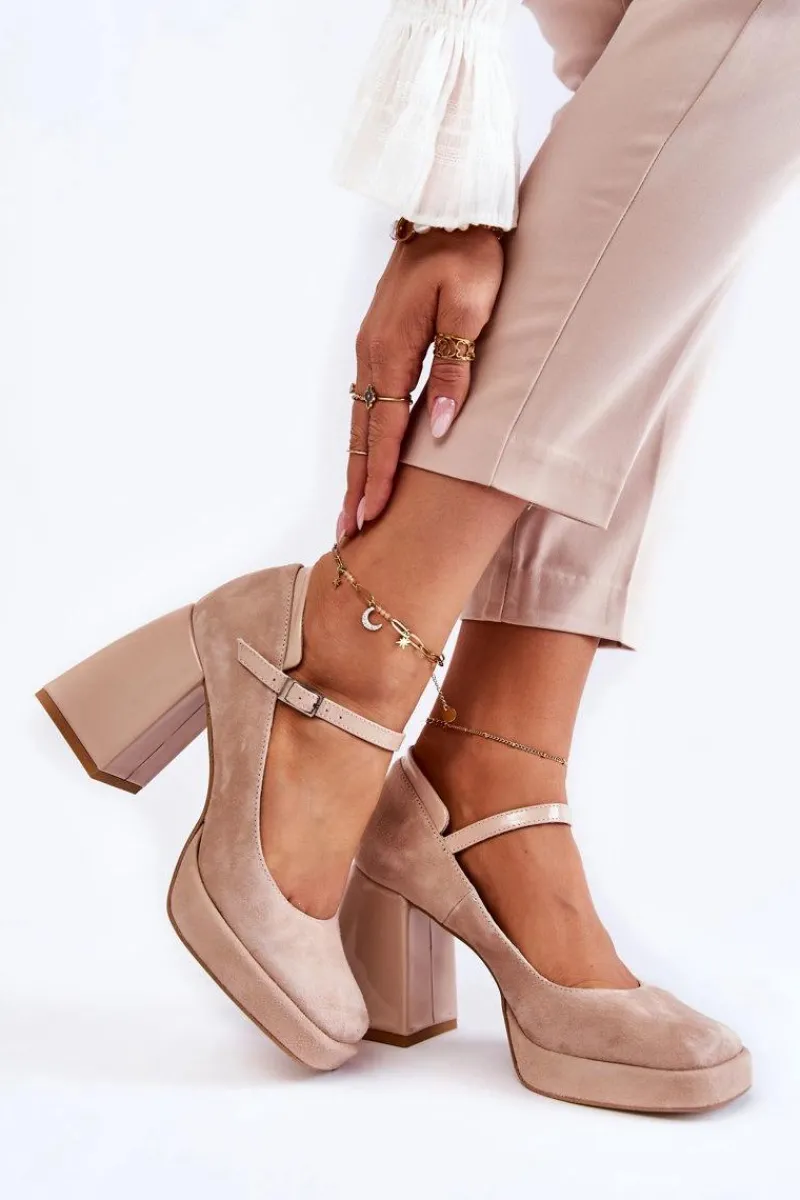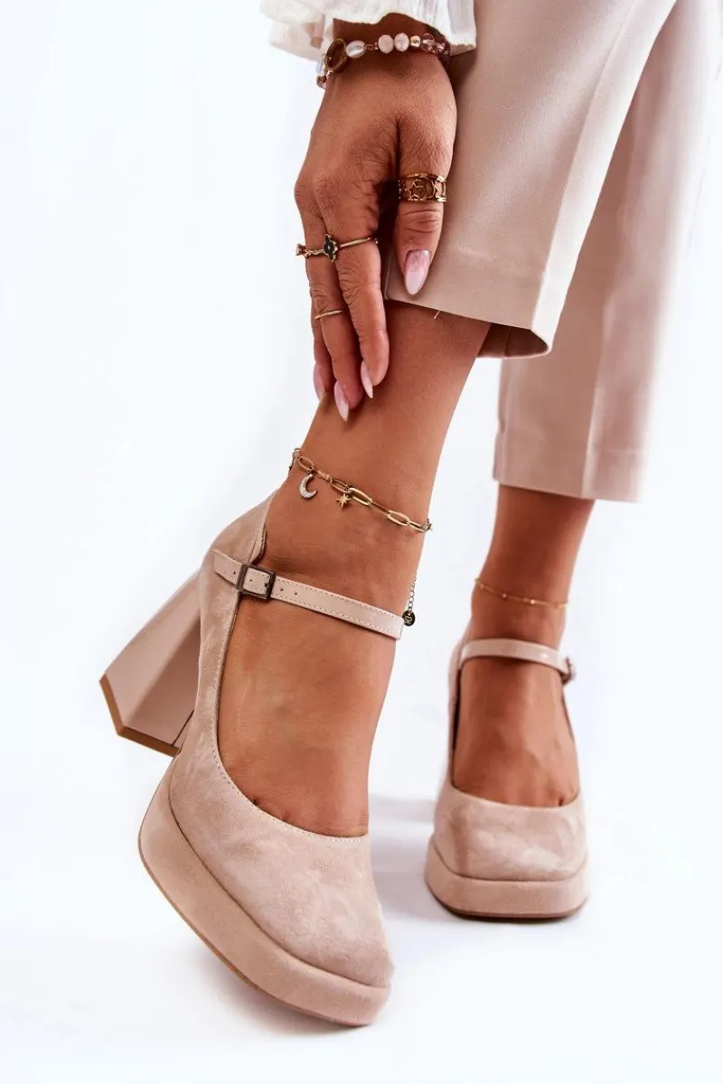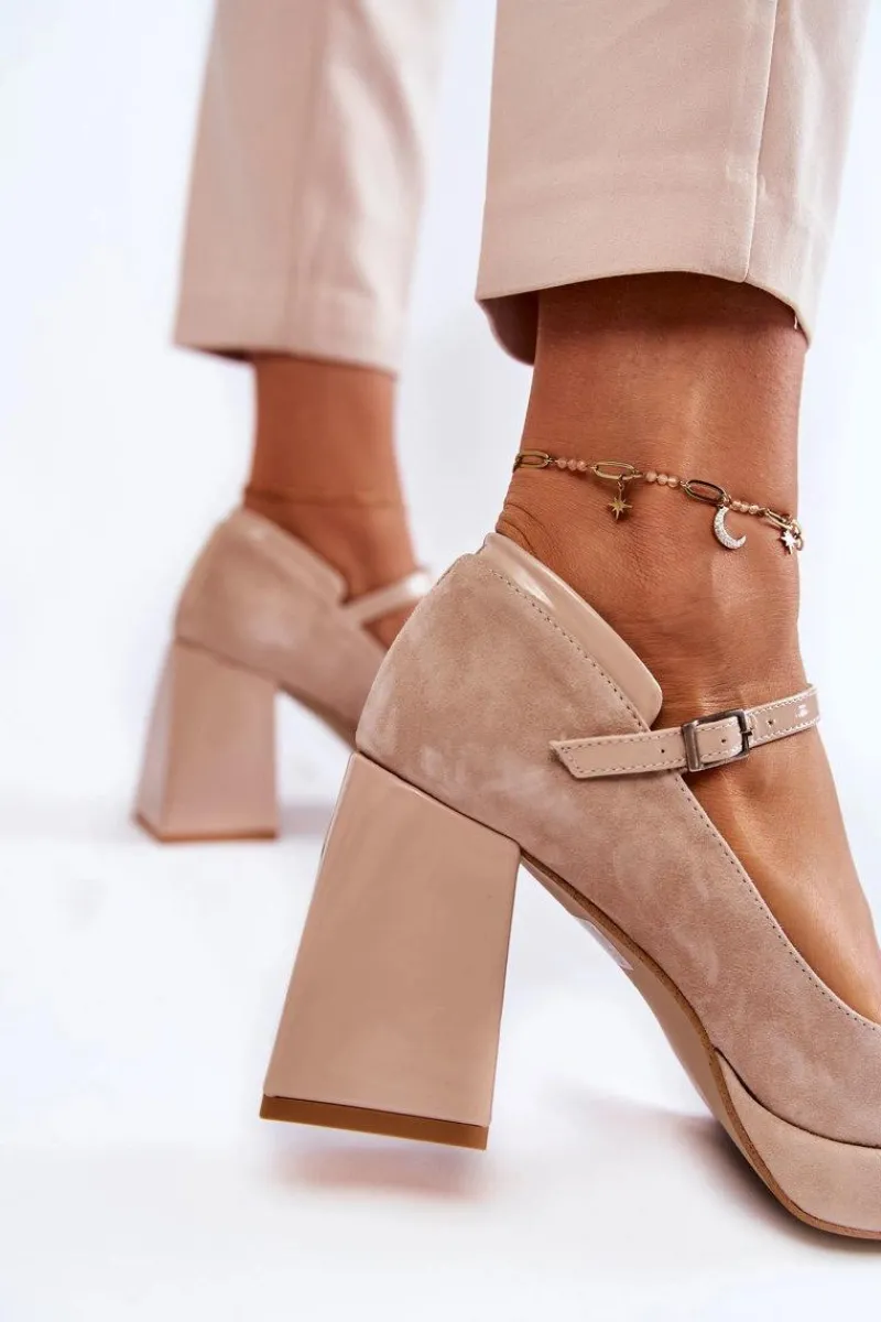 Wyjątkowe czółenka wykonane z wysokiej jakości naturalnej skóry. Posiadają regulowany pasek zapinany na sprzączkę. Osadzone na masywnym, wyższym obcasie w postaci klocka. Zapiętek jest usztywniany, a nosek kwadratowy. Miękka wkładka zapewnia wygodę podczas użytkowania. Dodatkowo buty posiadają delikatną platformę. Świetny model na różnego rodzaju uroczystości. Przy wyborze rozmiaru prosimy sugerować się tabelą rozmiarów.