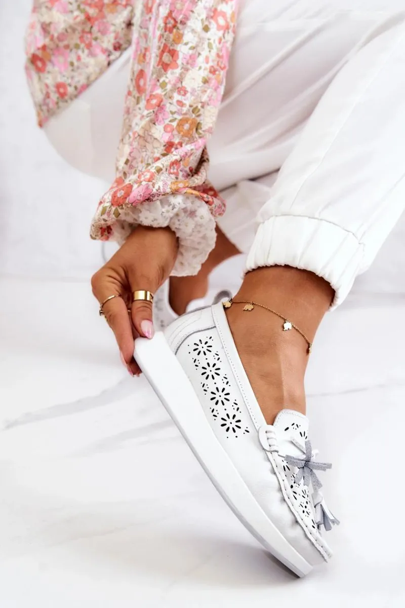 Piękne ażurowe mokasyny, które idealnie sprawdzą się jako dodatek do oryginalnych i nietuzinkowych stylizacji! Buty te idealnie sprawdzają się zarówno w wiosennych, jak i w letnich stylizacjach. Wykonane z naturalnej skóry. Lekkie oraz przewiewne. O komfort zadba skórzana, profilowana wkładka typu Comfort Line. Mokasyny posiadają platformę wykonaną z tworzywa sztucznego oraz frędzelki na przodzie obuwia. Świetny model, który powinnaś mieć! Przy wyborze rozmiaru prosimy sugerować się tabelą rozmiarów.