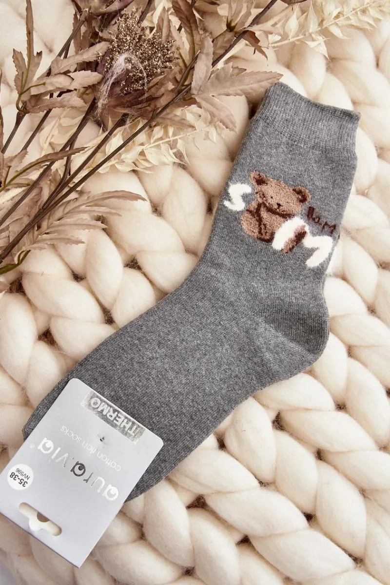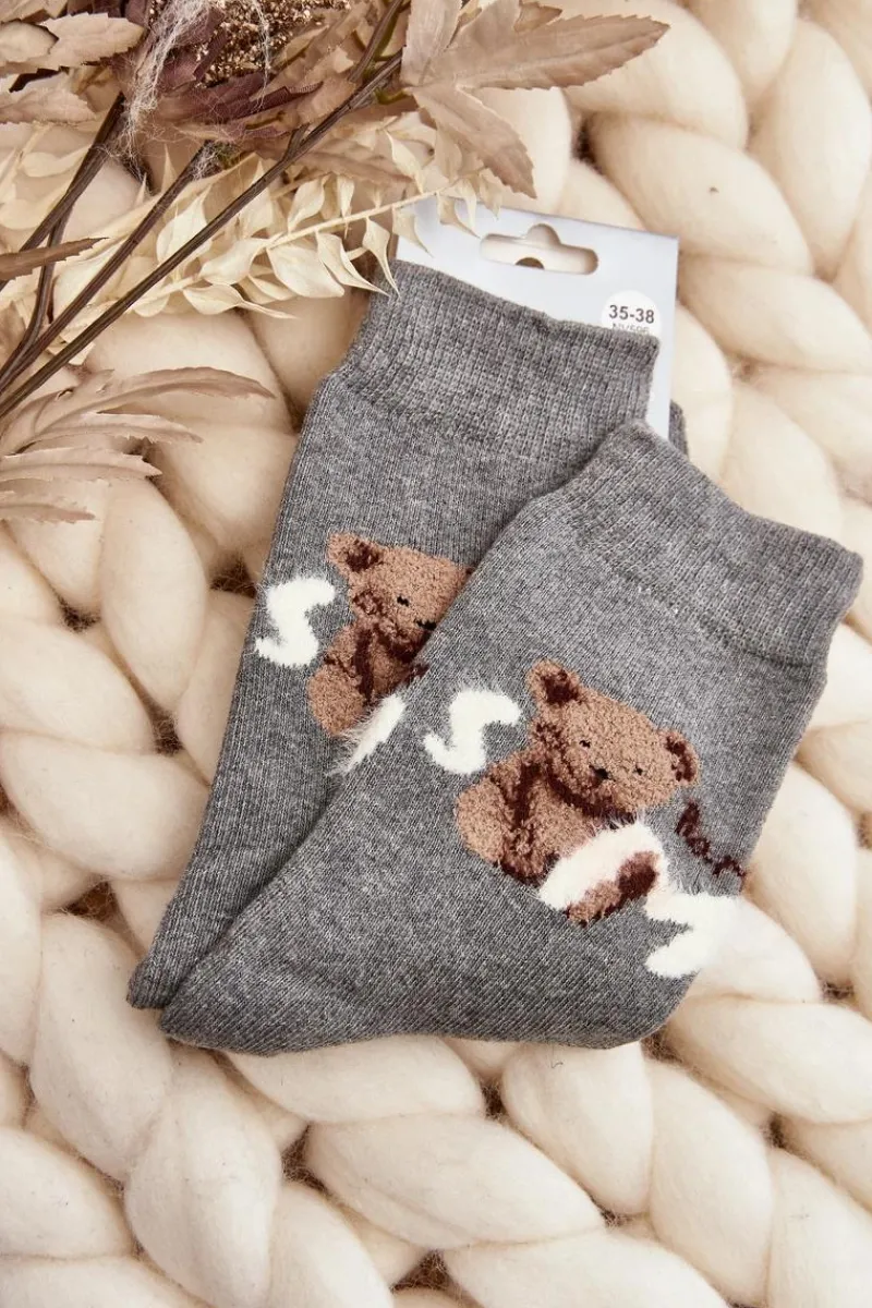 Ciepłe skarpety damskie idealne na mroźne dni. Model z naszywką w postaci misia. Lekki ściągacz sprawi, że będą idealnie dopasowane do tęgości nogi. Koniecznie powinnaś je mieć!