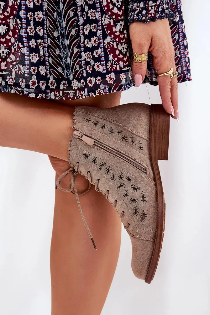 Botki damskie z eko zamszu to stylowa propozycja na chłodniejsze dni. Niska cholewka ozdobiona ażurowym wzorem nadaje im lekkości. Sznurowane i zapinane na zamek, co zapewnia łatwość zakładania oraz dopasowanie do stopy. Te botki będą doskonałym wyborem do codziennych stylizacji, łącząc funkcjonalność z modnym wyglądem.Przy wyborze rozmiaru prosimy sugerować się poniższą tabelą rozmiarów.