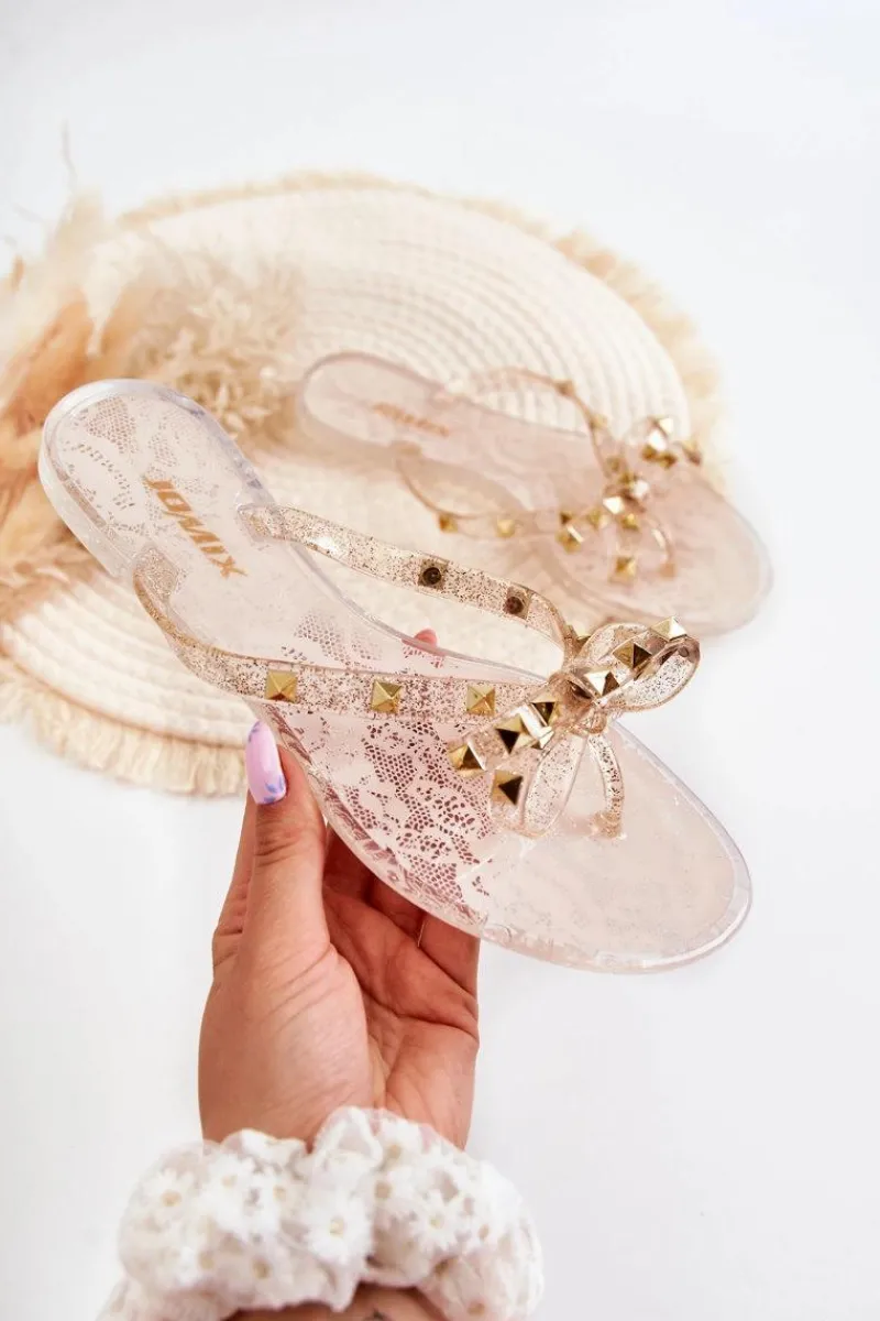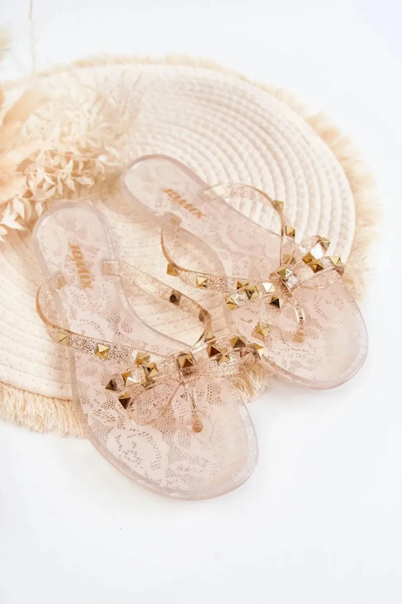 Wyjątkowe klapki o fasonie japonek zostały wykonane z gumowego tworzywa. Posiadają ozdobne elementy na paskach w postaci ćwieków. Na przodzie znajduje się urocza kokardka. Wkładka została wykonana z tworzywa sztucznego. Buty osadzone na płaskim obcasie. Ten model świetnie sprawdzi się podczas upalnych dni! Koniecznie musisz je mieć!