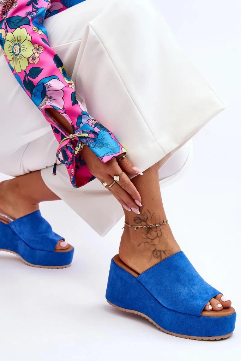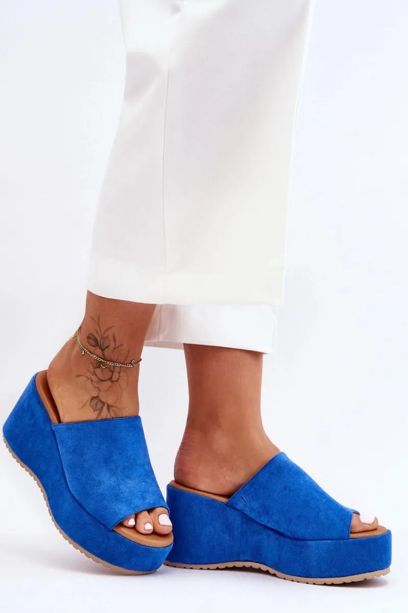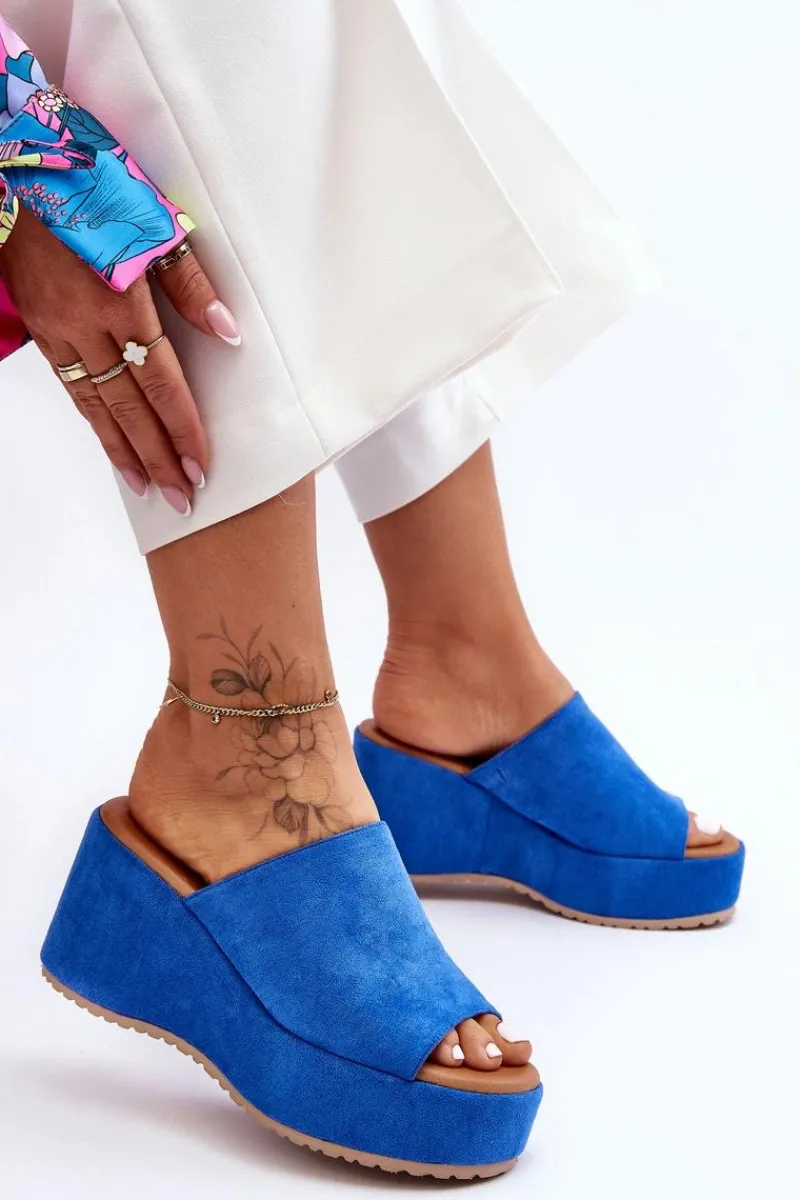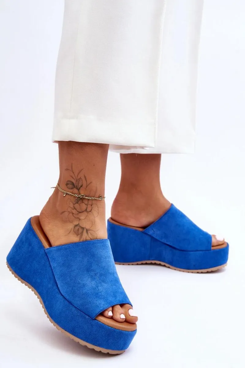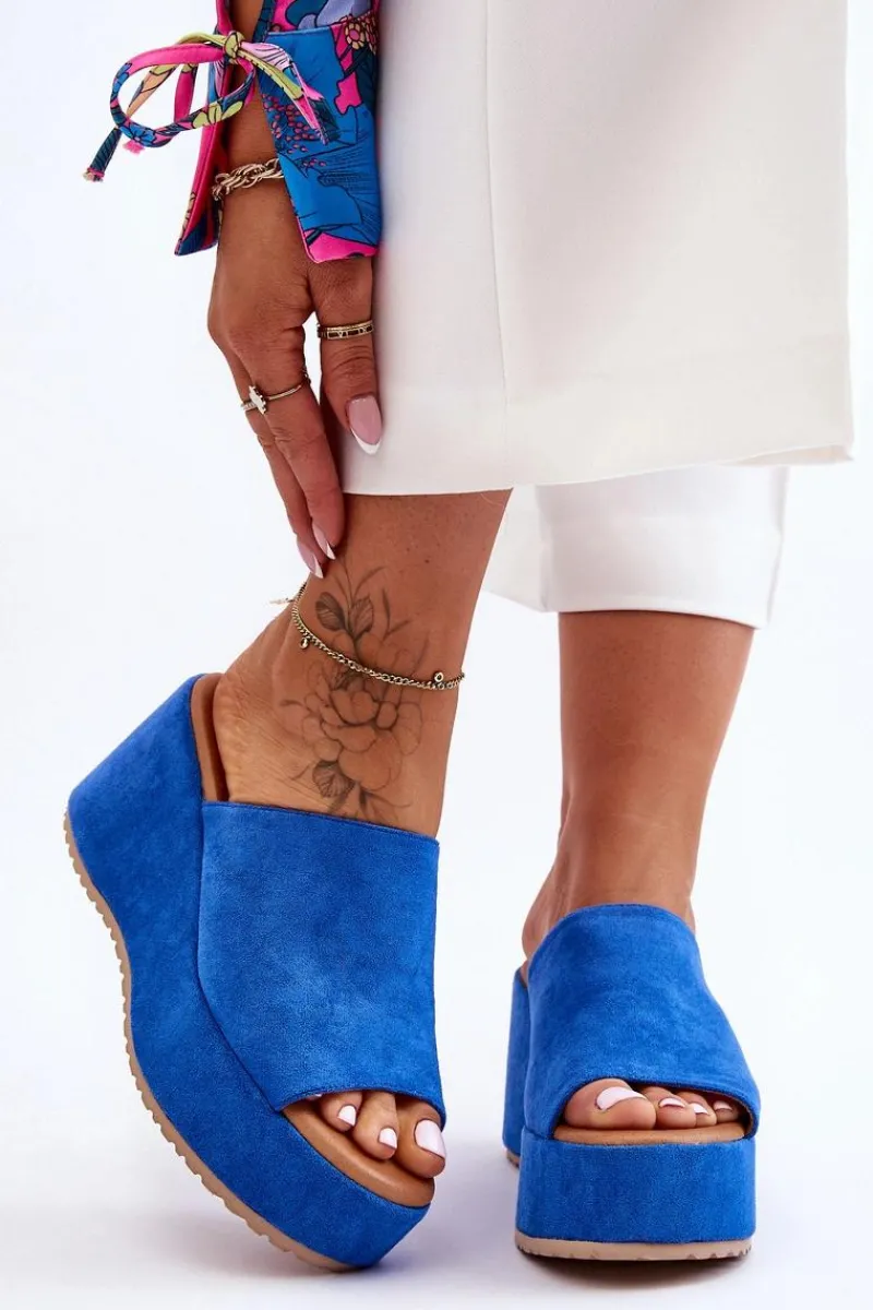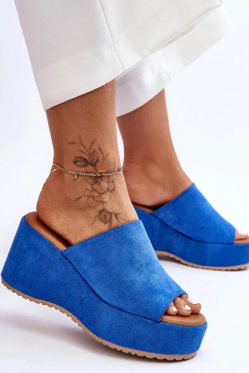 Wyjątkowe, damskie klapki zostały osadzone na masywnej platformie i koturnie. Wykonane z wierzchu z miłego w dotyku eko zamszu. Miękka wkładka została wykonana z eko skóry. Klapki posiadają odkryty nosek. Model ten posiada podeszwę z tworzywa sztucznego. Te klapki to świetny wybór na letnie, upalne dni! Przy wyborze rozmiaru prosimy sugerować się tabelą rozmiarów.