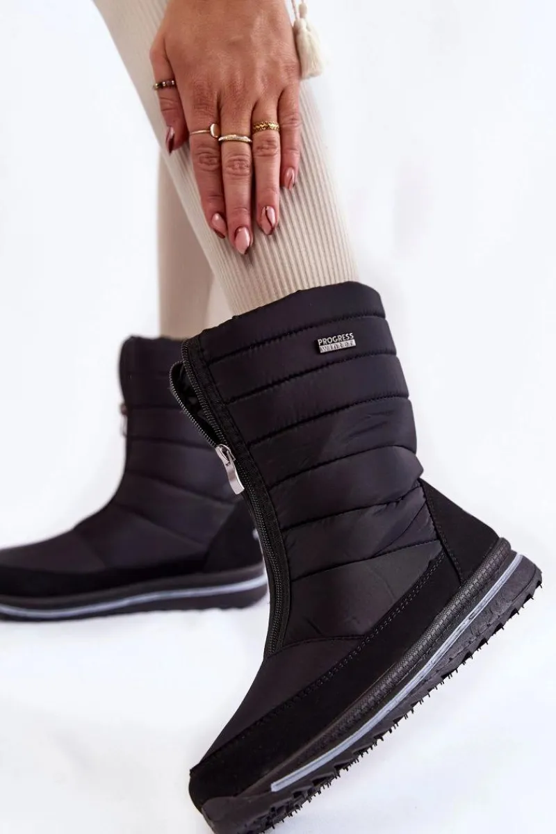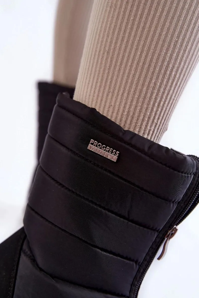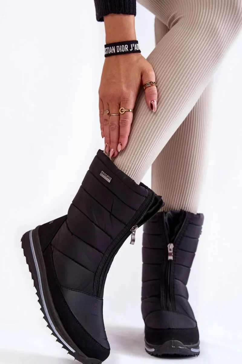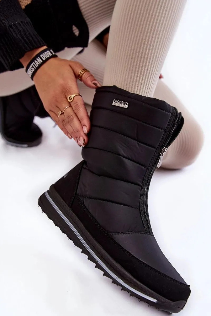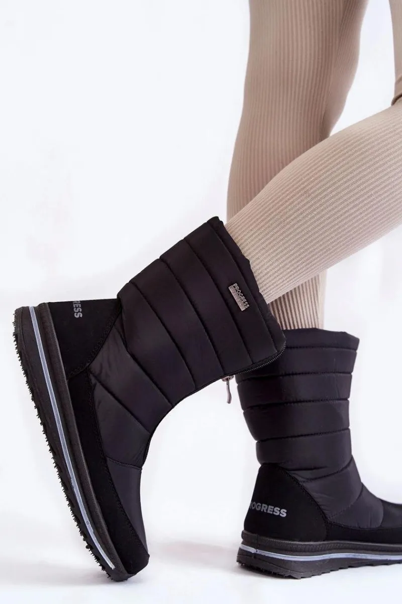 Damskie śniegowce są lekkie i wygodne w użytkowaniu. Wykonane z nieprzemakalnych materiałów. Śniegowce posiadają z przodu suwak. Modna cholewka z przeszyciami została wewnątrz ocieplona grubym futerkiem. Osadzone na platformie ze żłobieniami. Logo marki Progress znajduje się z boku oraz z tyłu śniegowców. Przy wyborze rozmiaru, prosimy sugerować się tabelą rozmiarów.