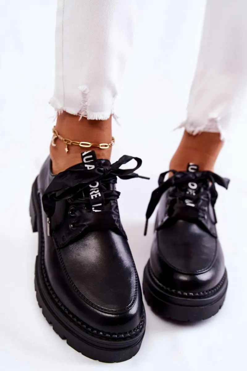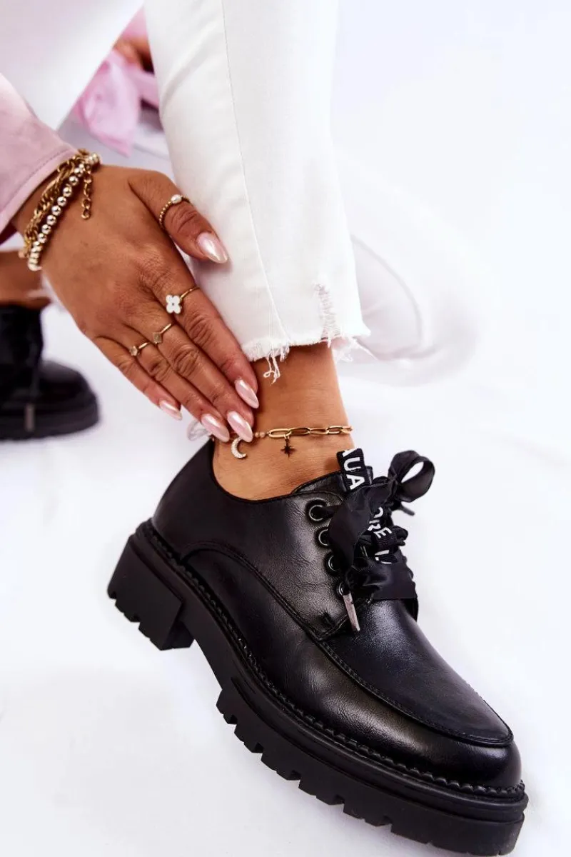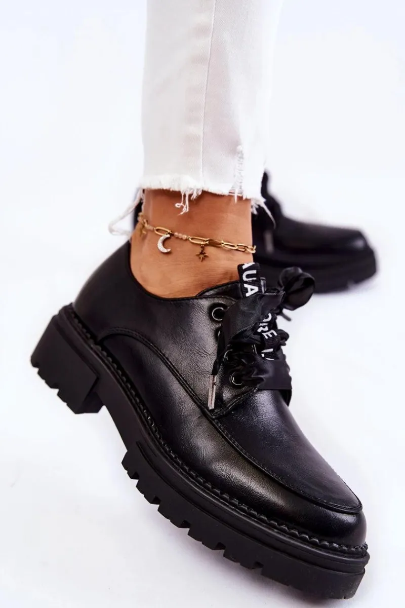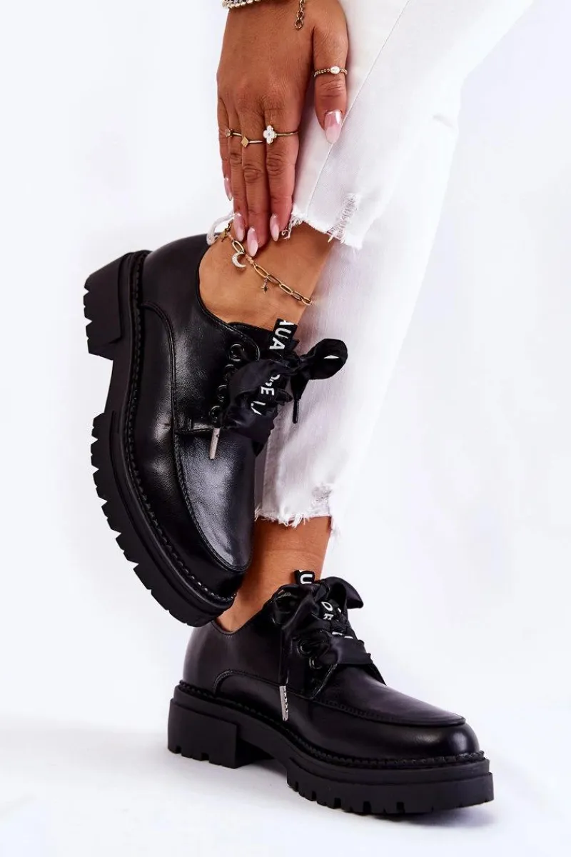 Modne półbuty damskie zostały wykonane z wysokiej jakości eko skórzanych materiałów. Miękka wkładka ze skóry naturalnej to gwarancja komfortu użytkowania nawet przez cały dzień. Sznurowanie w postaci wstążki sprawia, że te buty wyglądają naprawdę elegancko. Płaski, masywny obcas oraz delikatna platforma zapewnią stabilizację na każdym kroku. Ten model sprawdzi się w wielu stylizacjach! Podczas wyboru rozmiaru prosimy sugerować się tabelą rozmiarów.