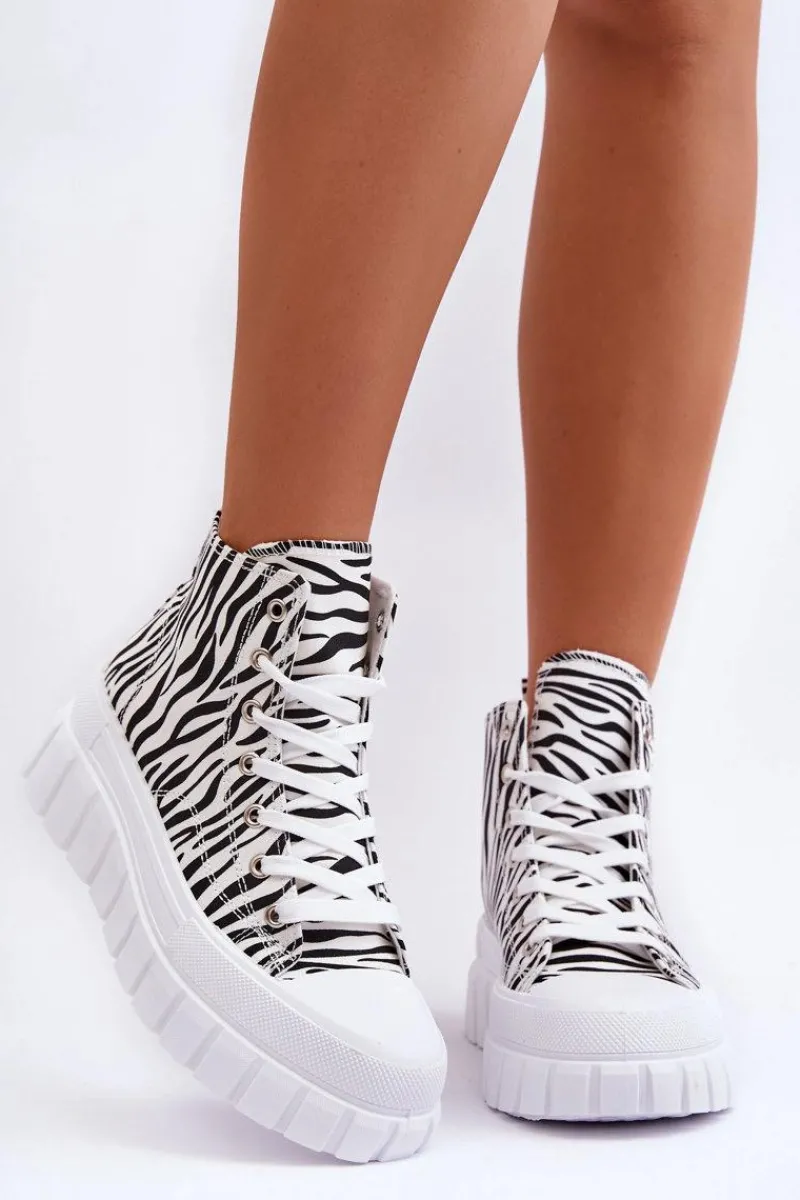 Stylowe, wysokie trampki damskie zostały wykonane z materiału tekstylnego. Model ten jest klasycznie sznurowany i ozdobiony zwierzęcym wzorem. Buty zostały osadzone na masywnej, gumowej platformie. Z pewnością zakochasz się w tym modelu! Przy wyborze rozmiaru prosimy sugerować się tabelą rozmiarów.