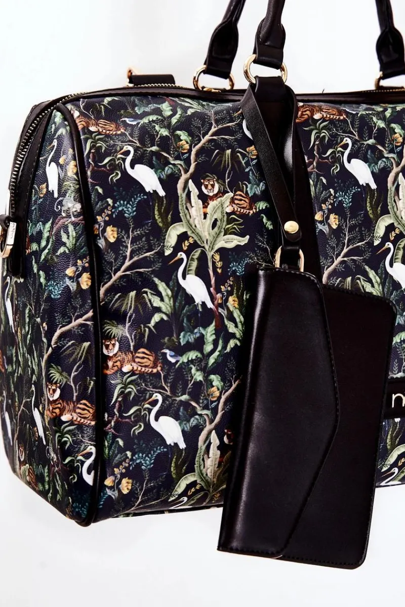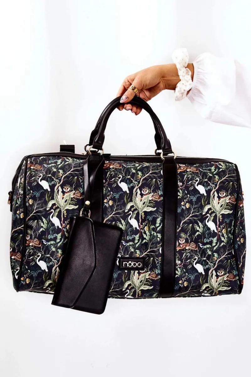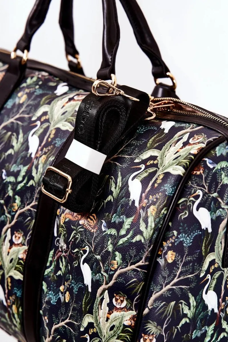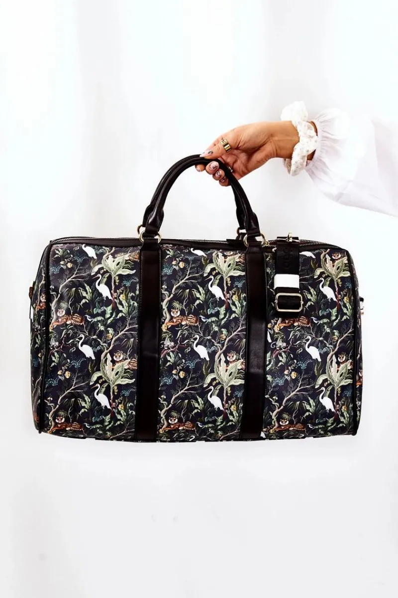 Elegancka torba podróżna świetnie sprawdzi się podczas weekendowego wyjazdu. Wykonana z wysokiej jakości eko skóry w print. Posiada odpinany, regulowany pasek. Jest niezwykle duża, dzięki czemu zmieści wiele potrzebnych rzeczy. Torba zamykana jest na suwak. Dodatkowo do torby jest dołączona saszetka zapinana na magnes, która jest odpinana od torby za pomocą napy. W komorze znajdują się dwie otwarte kieszenie oraz jedna zapinana na suwak.