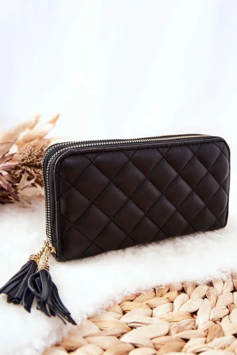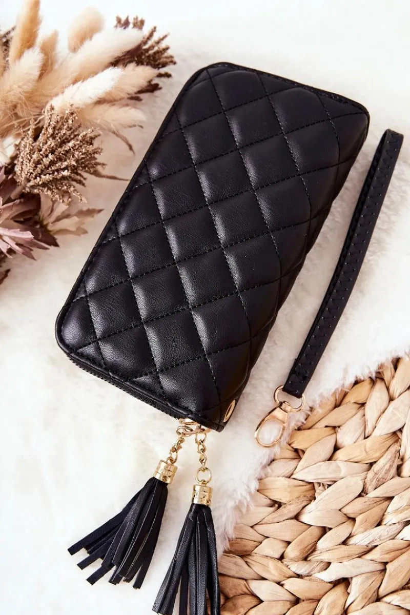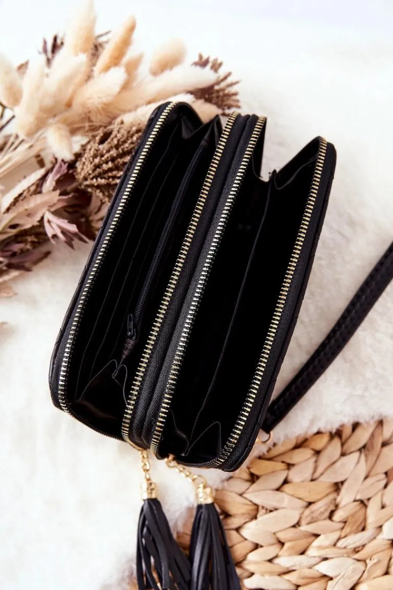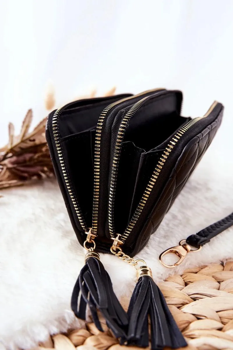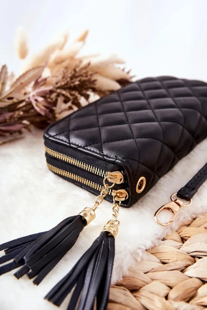 Duży i praktyczny portfel zapinany z zewnątrz na dwa zamki błyskawiczne. W jednej z przegródek można znaleźć miejsce na bilony, banknoty oraz wizytówki, natomiast w drugiej można umieścić niewielkiego smartfona lub banknoty czy dokumenty. Z zewnątrz portfel został wykonany z pikowanej eko skóry, a przy zamkach znajdują się frędzelki. Dodatkowo w zestawie jest dołączony paseczek.