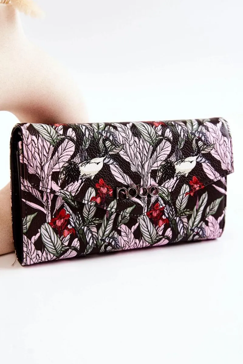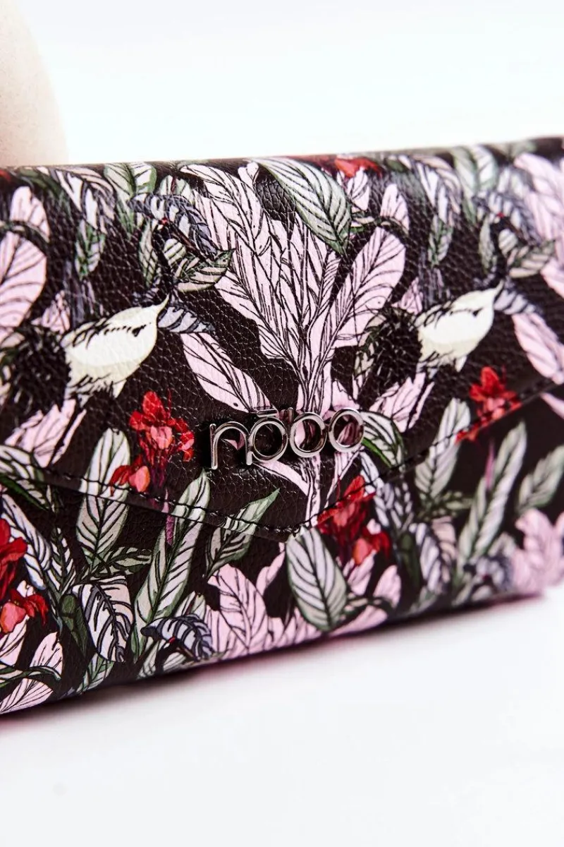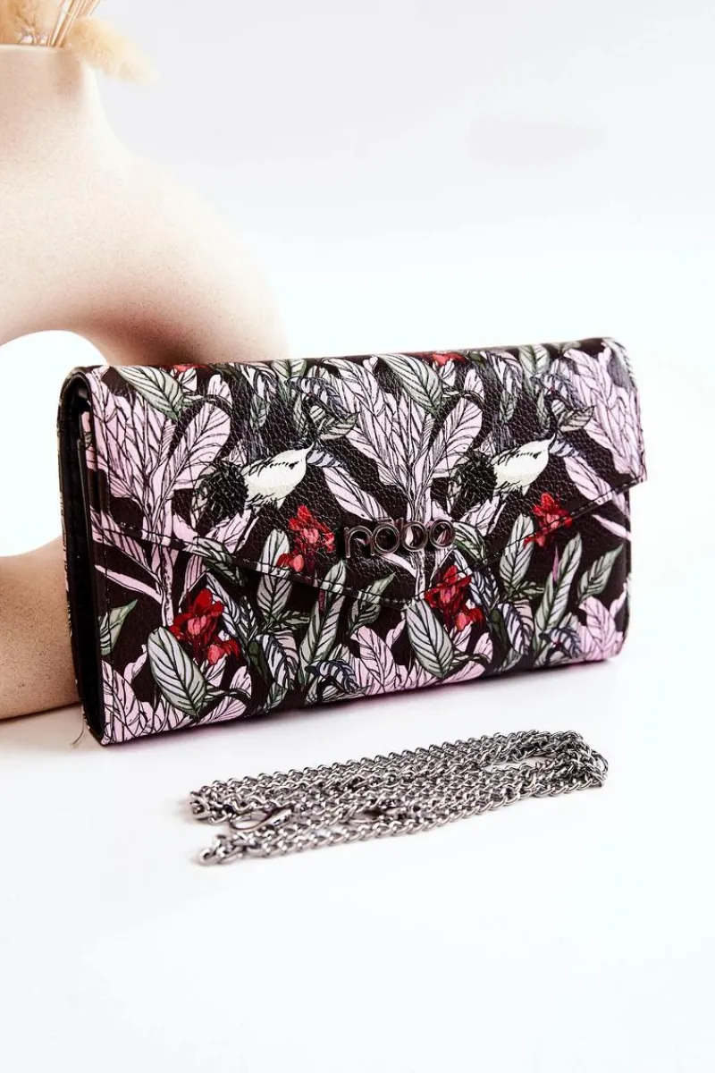 Duży, damski portfel zapinany na magnes. Został wykonany z wysokiej jakości eko skóry z dbałością o szczegóły. Na klapie logo marki Nobo. W środku znajdują się trzy komory – dwie posiadają miejsca na wizytówki czy karty płatnicze oraz banknoty, a jedna jest zapinana na zamek błyskawiczny. Dodatkowo do portfela jest dołączony metalowy łańcuszek, dlatego możesz go nosić także jako torebkę. Jest to świetne rozwiązanie w przypadku, gdy potrzebujesz mieć przy sobie tylko najpotrzebniejsze rzeczy jak dokumenty, pieniądze czy smartfon.