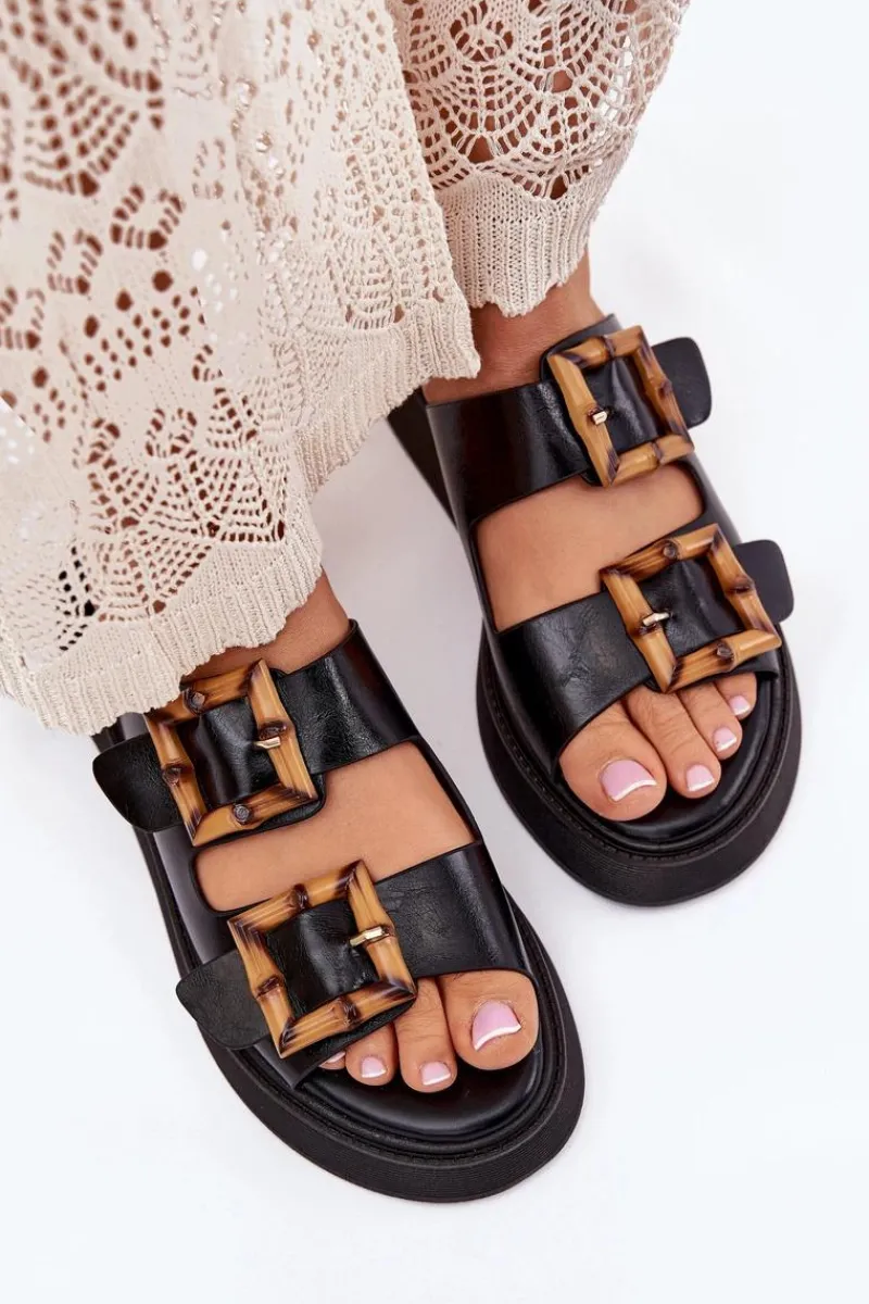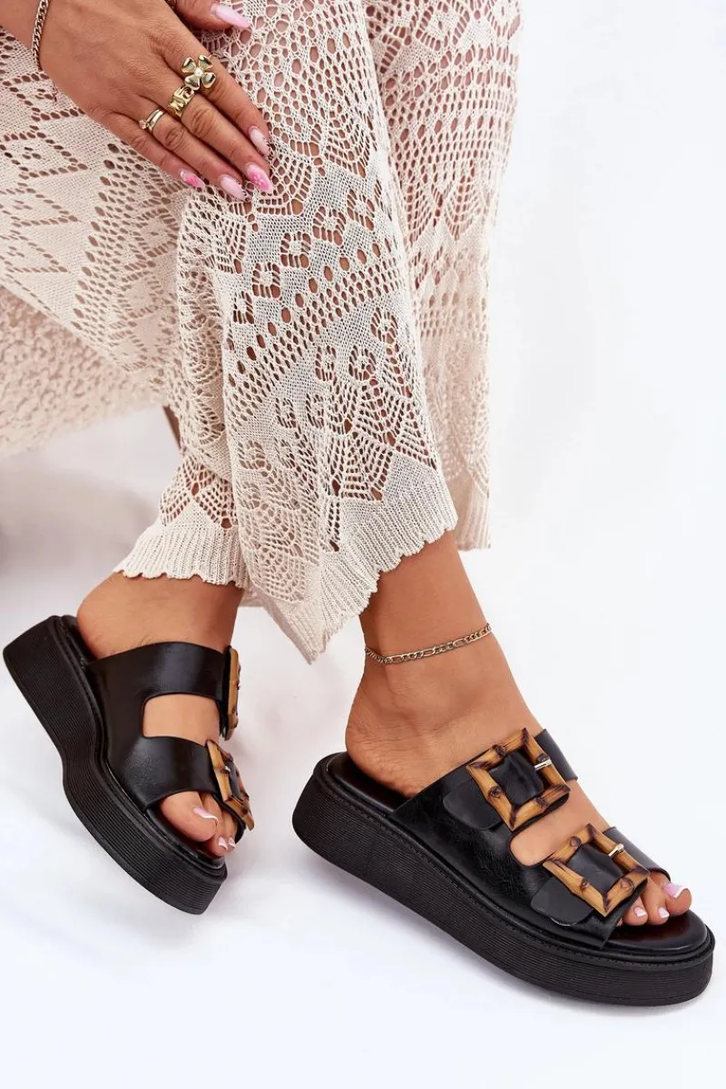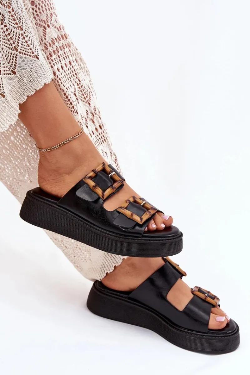 Klapki damskie z eko skóry na platformie to stylowa i wygodna propozycja na ciepłe dni. Dwie ozdobne klamry dodają im wyjątkowego charakteru, łącząc elegancję z nowoczesnym stylem. Miękka wkładka zapewni komfort przez cały dzień. Idealne do codziennych stylizacji, oferują połączenie funkcjonalności i modnego wyglądu. Przy wyborze rozmiaru rosimy sugerować się tabelą rozmiarów.