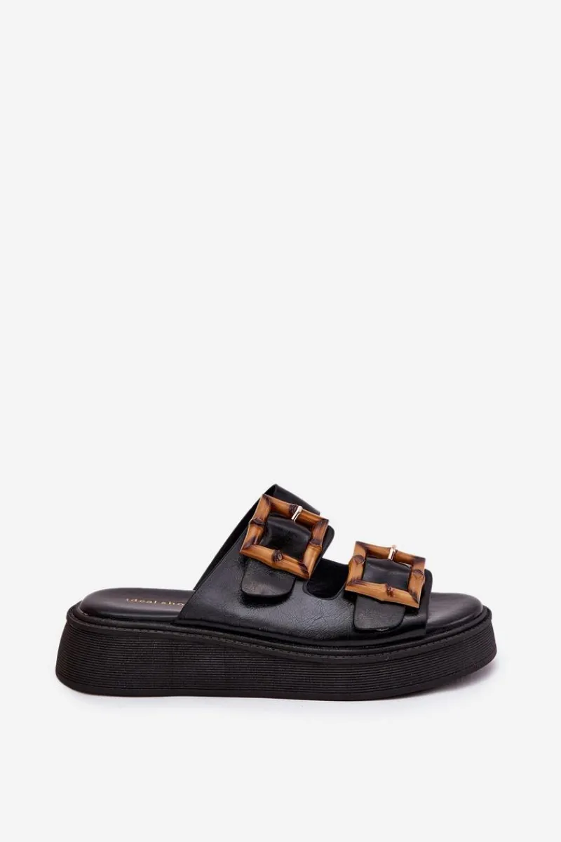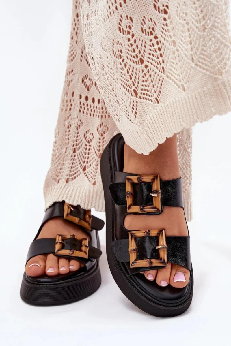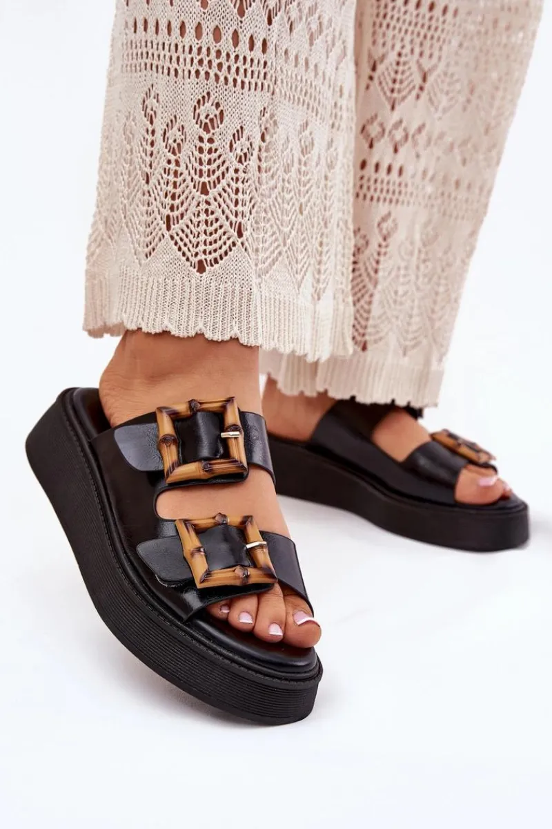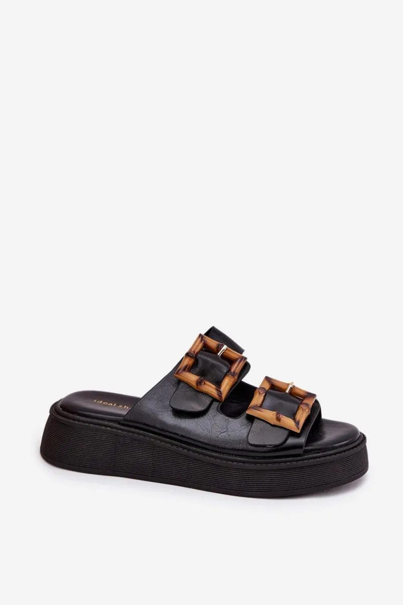 Klapki damskie z eko skóry na platformie to stylowa i wygodna propozycja na ciepłe dni. Dwie ozdobne klamry dodają im wyjątkowego charakteru, łącząc elegancję z nowoczesnym stylem. Miękka wkładka zapewni komfort przez cały dzień. Idealne do codziennych stylizacji, oferują połączenie funkcjonalności i modnego wyglądu. Przy wyborze rozmiaru rosimy sugerować się tabelą rozmiarów.