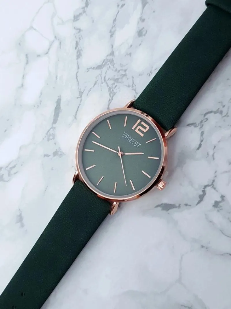 Damski zegarek Claire marki Ernest! Najnowszy model z piękną, szykowną kopertą oraz regulowanym paskiem. To idealny wybór dla eleganckich kobiet! Pasuje zarówno do codziennych stylizacji jak i tych bardziej eleganckich. Duża czytelna tarcza w kolorze paska. Nie czekaj dłużej, spraw sobie trochę elegancji w najwyższej jakości. Każdy zegarek zapakowany jest w ozdobne pudełko.