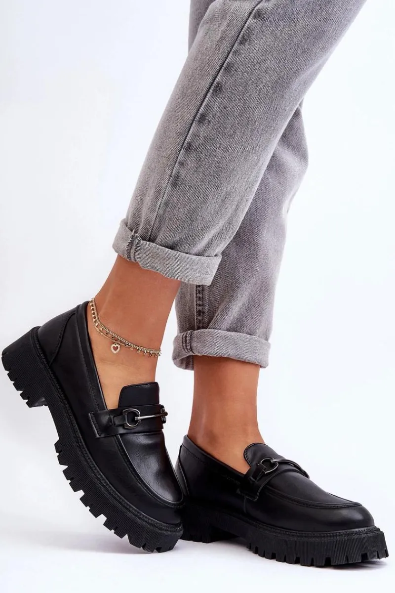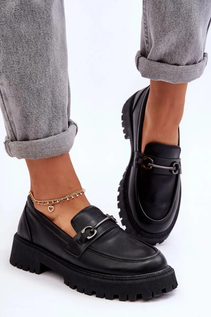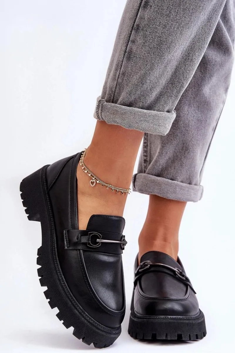 Stylowe, damskie mokasyny zostały wykonane z eko skóry. Buty te osadzono na masywnej platformie i płaskim obcasie. Posiadają miękką wkładkę, która pozwoli na wygodne użytkowanie obuwia. Dodatkowo z przodu na pasku znajduje się mała ozdoba. Świetnie wpasują się w wiele stylizacji wiosenno-jesiennych. Przy wyborze rozmiaru prosimy sugerować się tabelą rozmiarów.