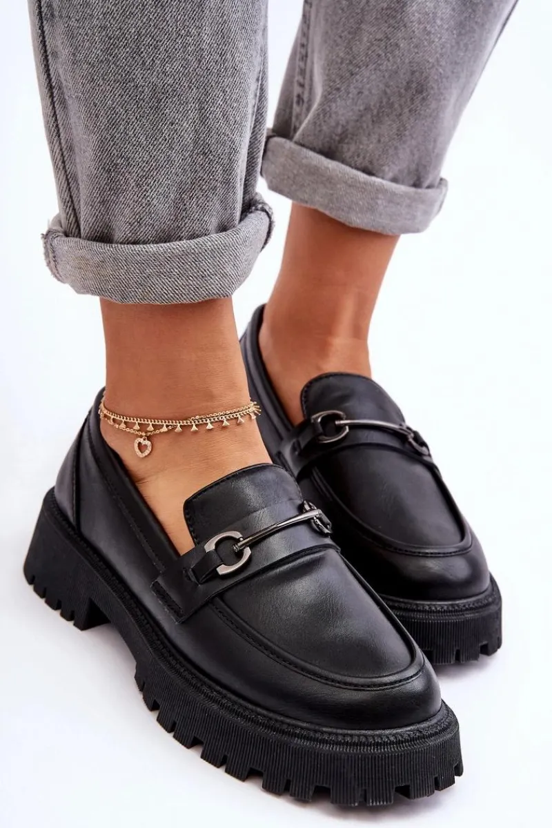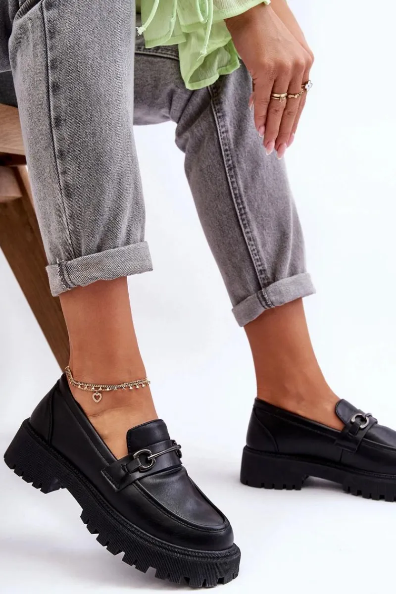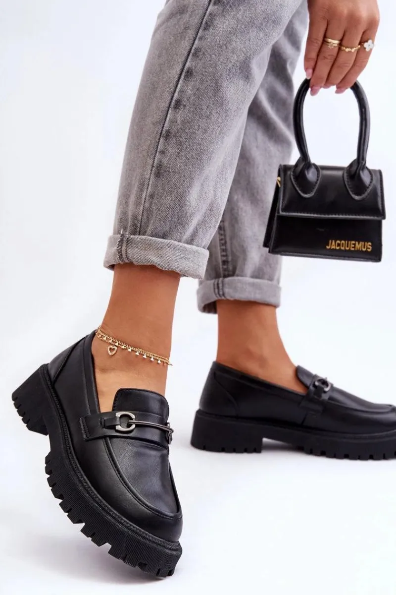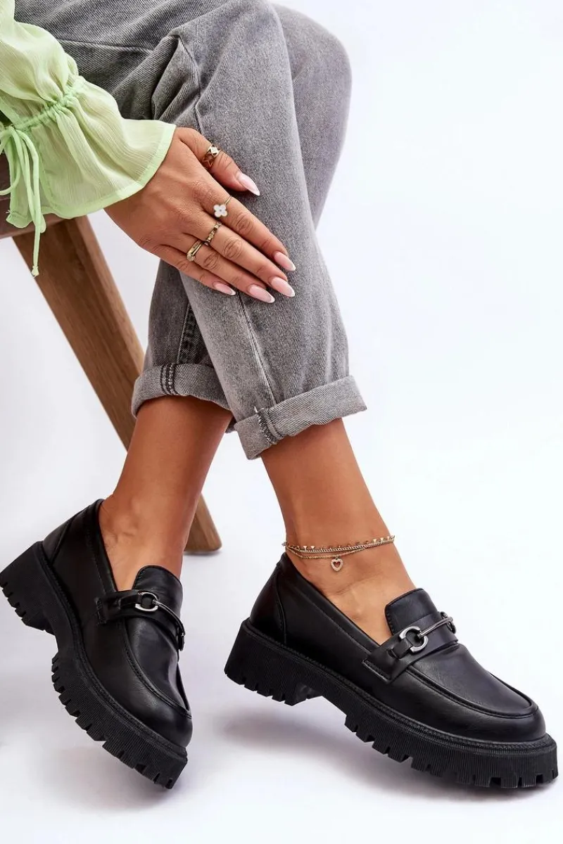 Stylowe, damskie mokasyny zostały wykonane z eko skóry. Buty te osadzono na masywnej platformie i płaskim obcasie. Posiadają miękką wkładkę, która pozwoli na wygodne użytkowanie obuwia. Dodatkowo z przodu na pasku znajduje się mała ozdoba. Świetnie wpasują się w wiele stylizacji wiosenno-jesiennych. Przy wyborze rozmiaru prosimy sugerować się tabelą rozmiarów.