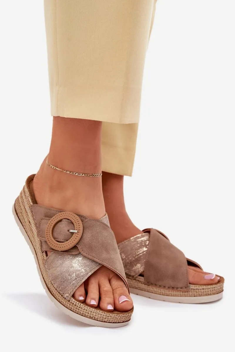 Klapki damskie od marki Inblu, osadzone na koturnie, to doskonały wybór na ciepłe dni. Wkładka z naturalnego zamszu zapewnia komfort i wygodę, a ozdobna klamra dodaje im eleganckiego charakteru. Lekkie i wygodne, stanowią idealne uzupełnienie codziennych stylizacji, łącząc funkcjonalność z modnym wyglądem. Przy wyborze rozmiaru prosimy sugerować się tabelą rozmiarów.