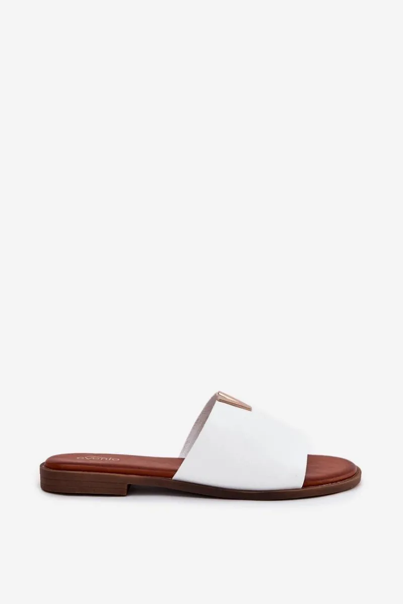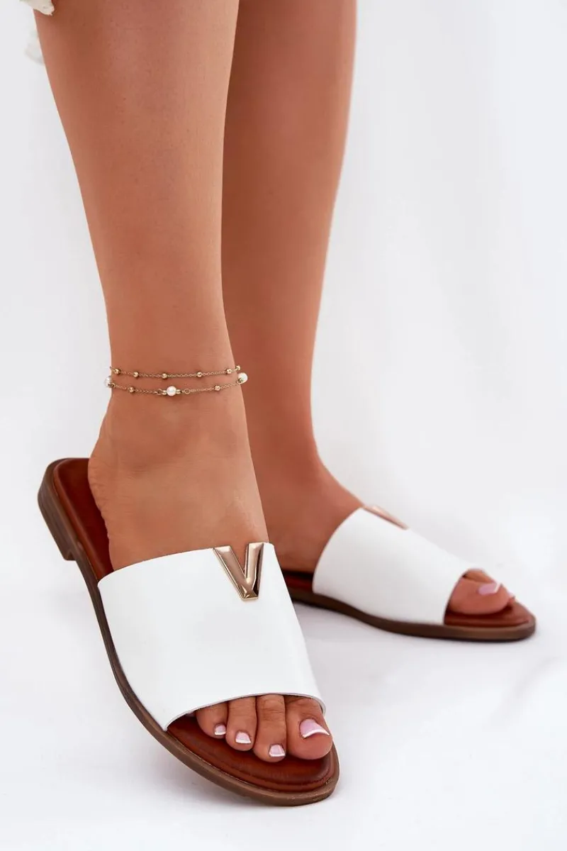 Klapki damskie wykonane ze skóry ekologicznej. Złoty element doda blasku Twojej letniej stylizacji. Osadzone na płaskim obcasie. Model ten będzie idealnym wyborem na wiele okazji! Przy wyborze rozmiaru prosimy sugerować się tabelą rozmiarów.
