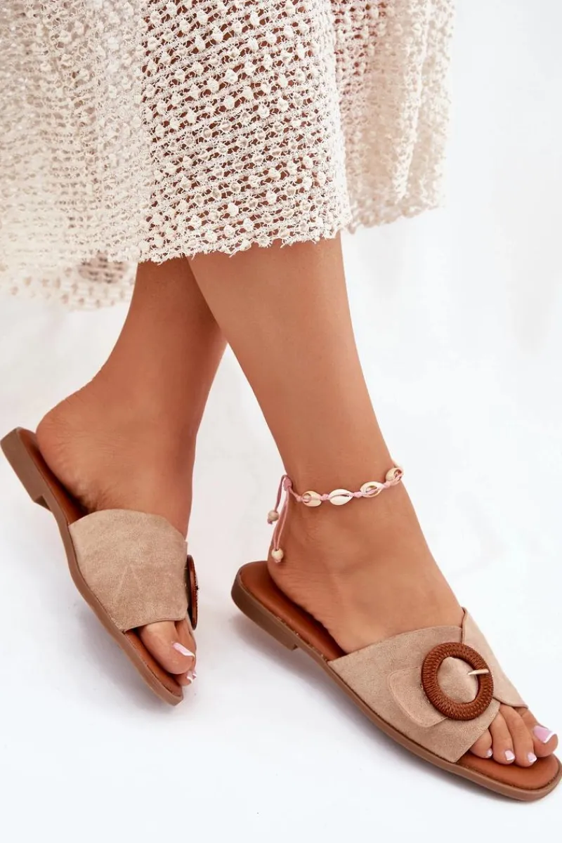 Klapki damskie na płaskim obcasie, wykonane z eko zamszu, to elegancka i komfortowa propozycja na ciepłe dni. Model ten wyróżnia się ozdobną klamrą, która dodaje im wyjątkowego charakteru. Idealne na co dzień, łączą prostotę z modnym akcentem, doskonale komponując się z letnimi stylizacjami. Przy wyborze rozmiaru prosimy sugerować się tabelą rozmiarów.