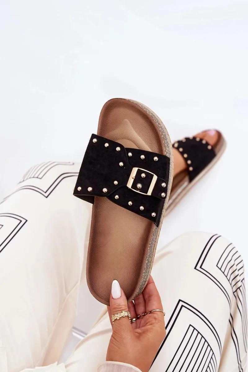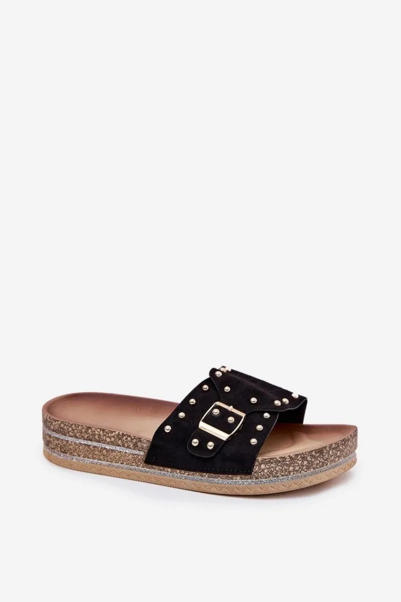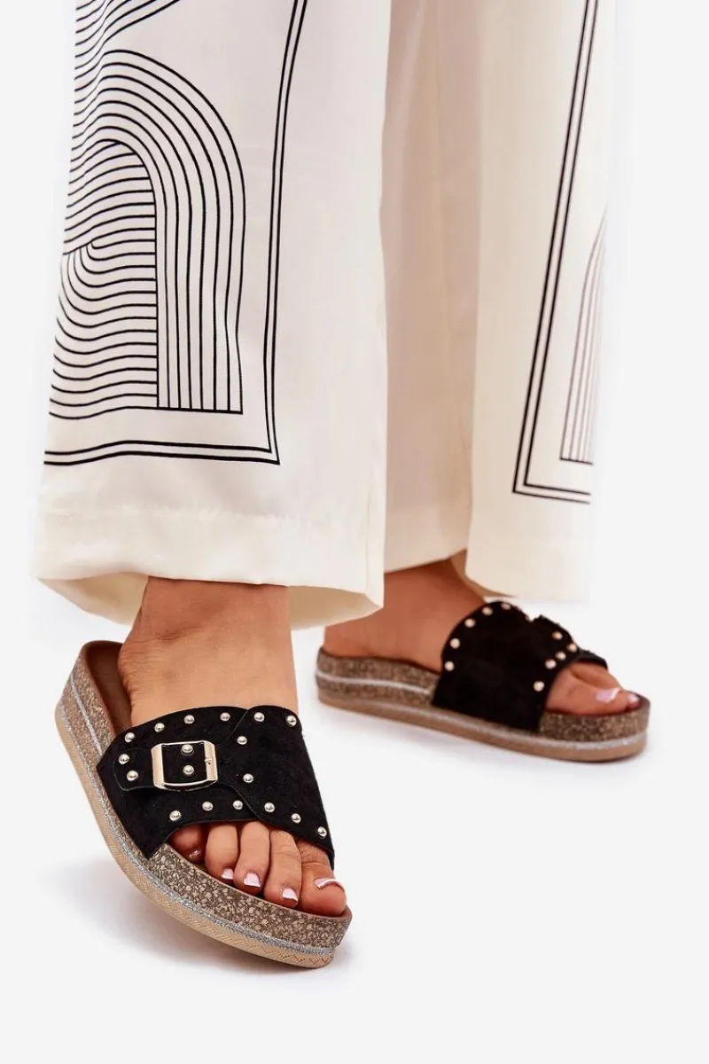 Stylowe klapki damskie z eko zamszu, ozdobione klamrą i ćwiekami, które nadają im nowoczesnego i odważnego charakteru. Osadzone na platformie z brokatem, które wprowadzają do każdej stylizacji subtelny blask. Doskonałe na letnie dni, te klapki łączą wygodę z modnym wyglądem, świetnie pasując do sukienek, spódnic i spodni. Przy wyborze rozmiaru rosimy sugerować się tabelą rozmiarów.