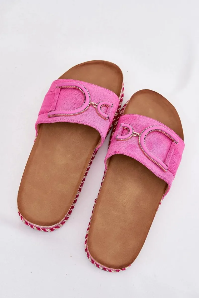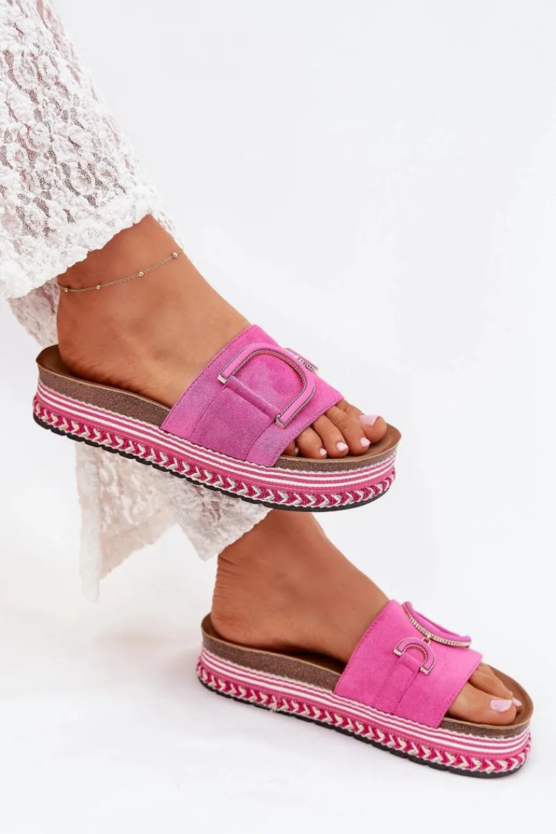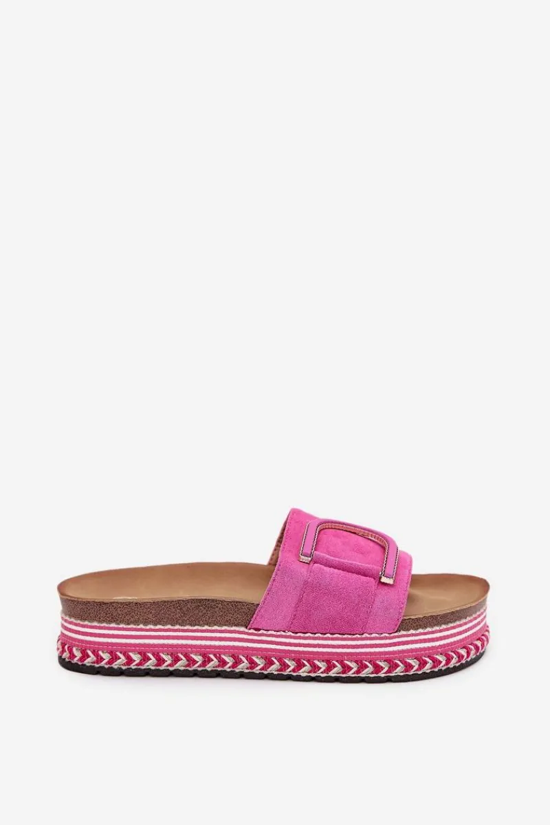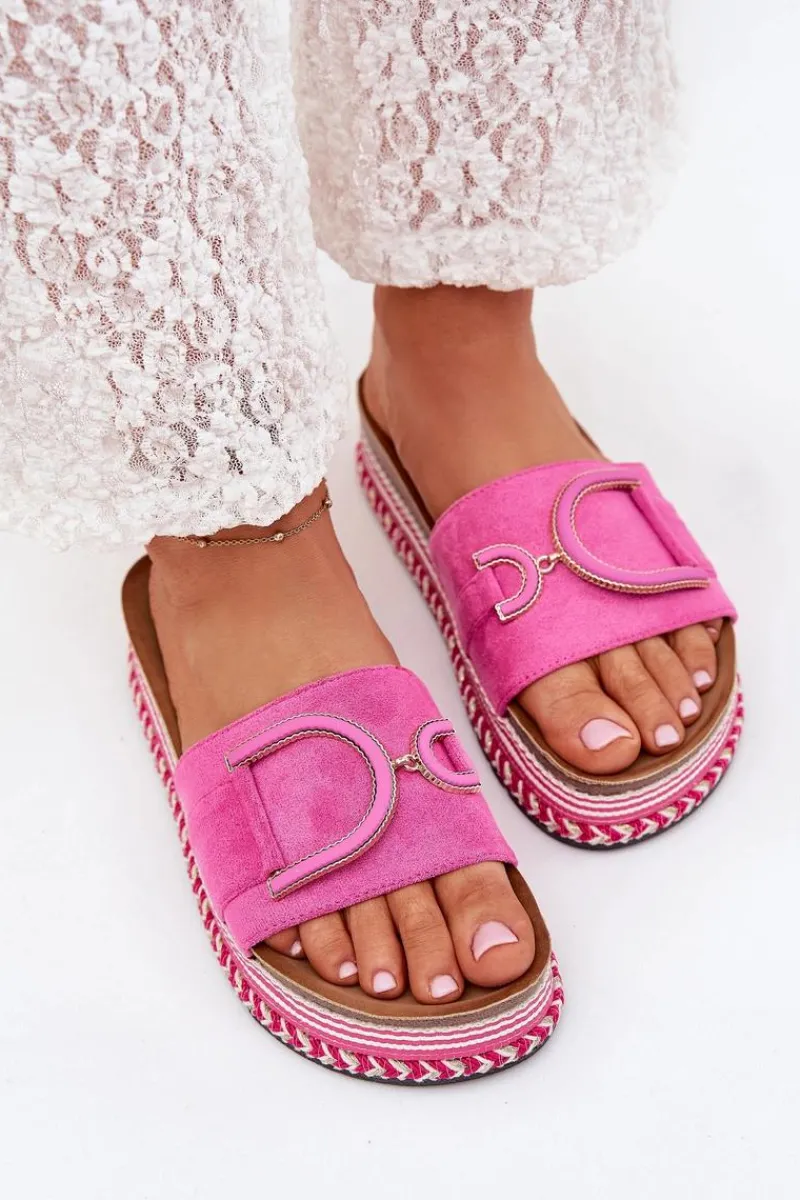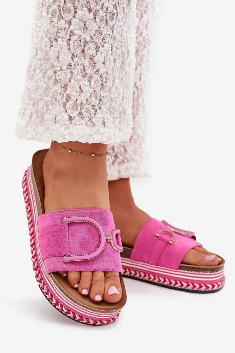 Klapki damskie wykonane z eko zamszu, osadzone na masywnej platformie, łączą wygodę z modnym wyglądem. Z przodu na pasku znajduje się ozdobny element, który dodaje im unikalnego charakteru. Profilowana wkładka zapewnia komfort przez cały dzień, sprawiając, że klapki są doskonałe do letnich stylizacji. Przy wyborze rozmiaru prosimy sugerować się tabelą rozmiarów.