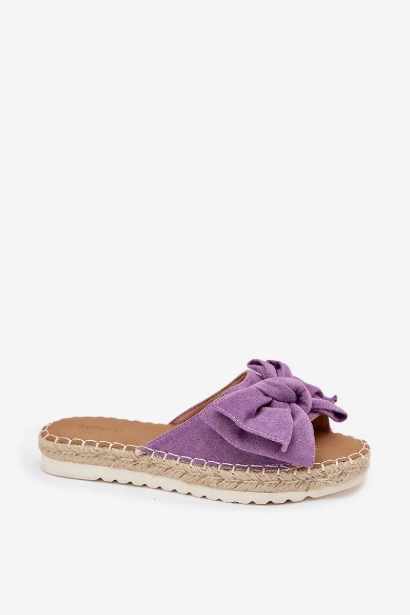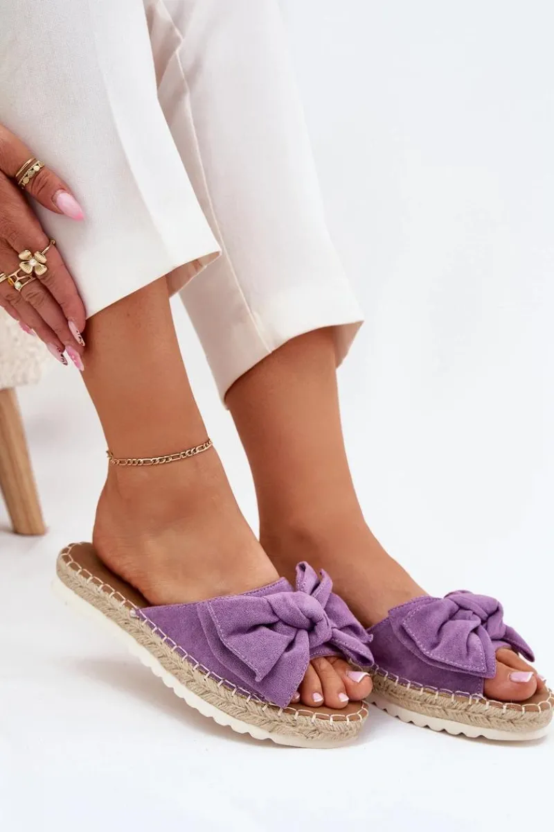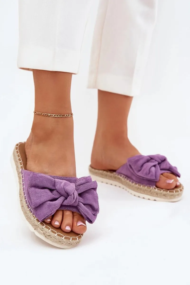 Klapki damskie wykonane z eko zamszu. Osadzone na platformie z plecionką to stylowa i wygodna propozycja na ciepłe dni. Z przodu znajduje się subtelna kokardka, która dodaje im uroku. Lekkie i komfortowe, doskonale pasują do sukienek, spódnic oraz spodni. Przy wyborze rozmiaru rosimy sugerować się tabelą rozmiarów.