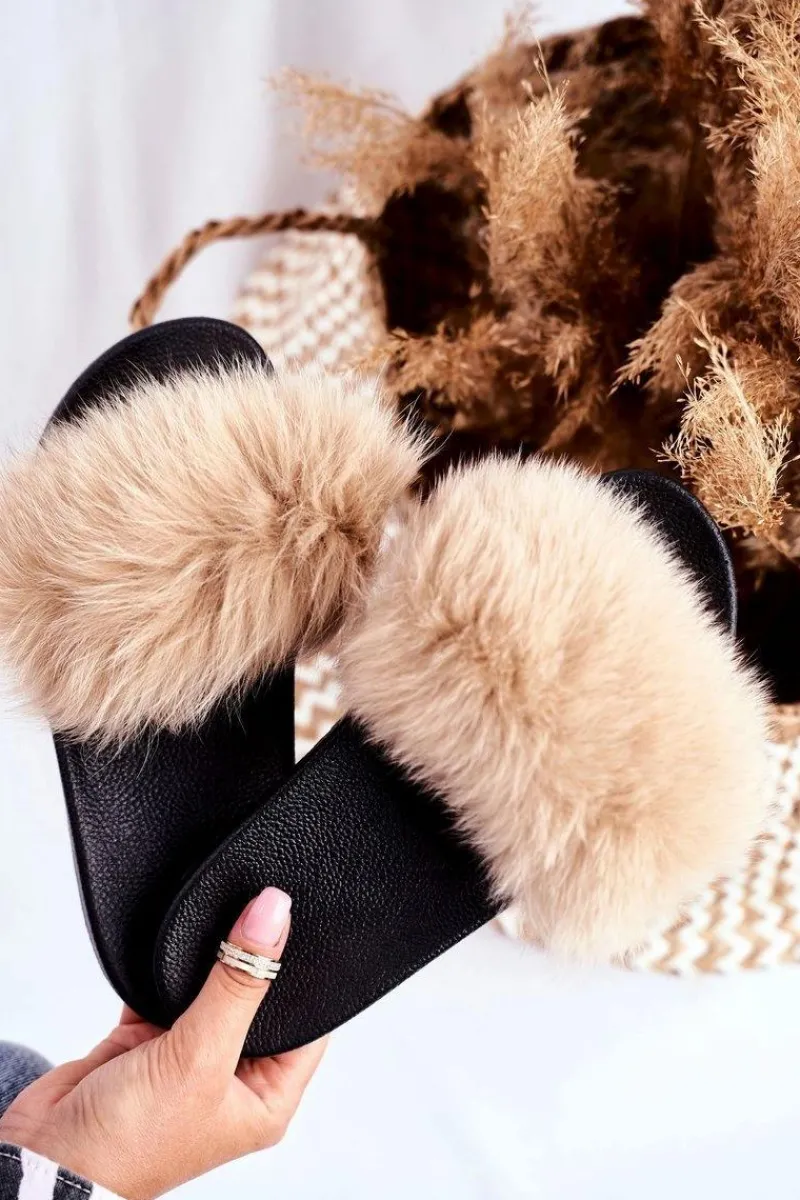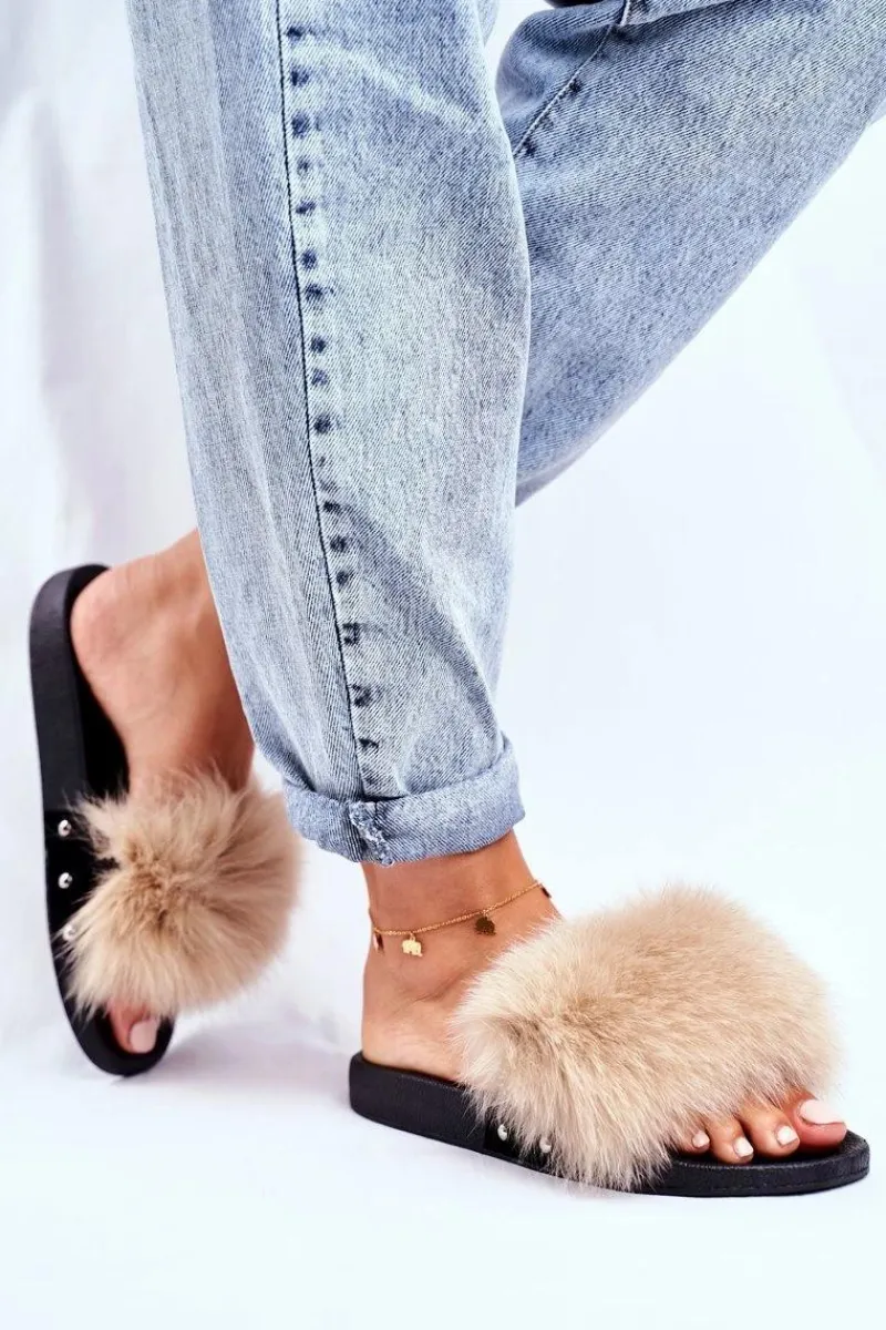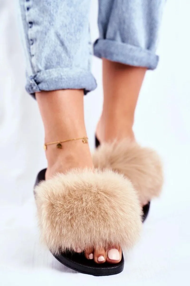 Hot Klapki Damskie z Naturalnym Futerkiem Beżowe Bushido Damskie Klapki Z Futerkiem|Klapki Damskie Klasyczne