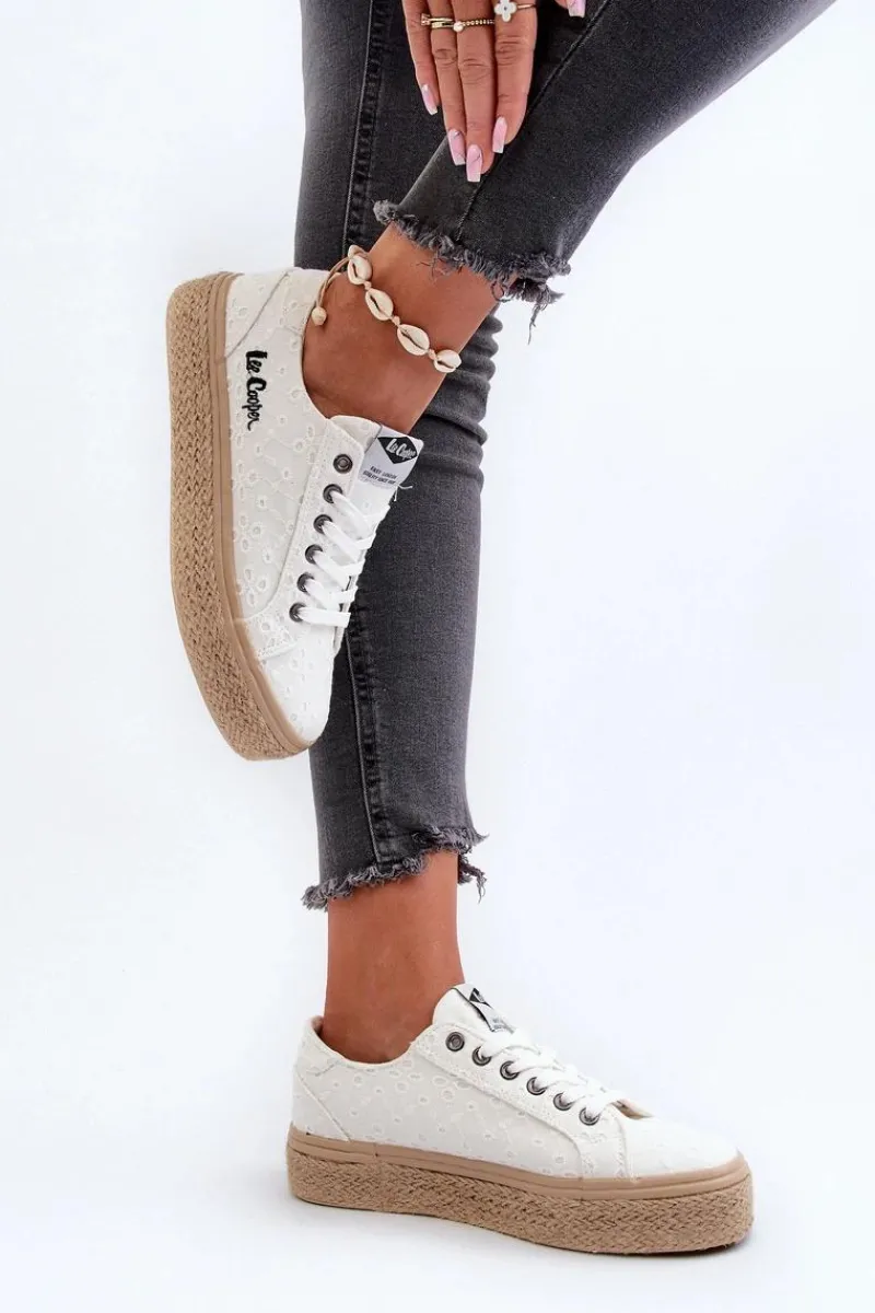 Damskie trampki marki Lee Cooper wykonane z materiału tekstylnego. Osadzone na platformie z jutową plecionką. Koronkowa cholewka dodaje im delikatność. Ten niezwykle modny fason idealnie dopełni Twoje wiosenno-letnie stylizacje! Przy wyborze rozmiaru prosimy sugerować się poniższą tabelą rozmiarów.