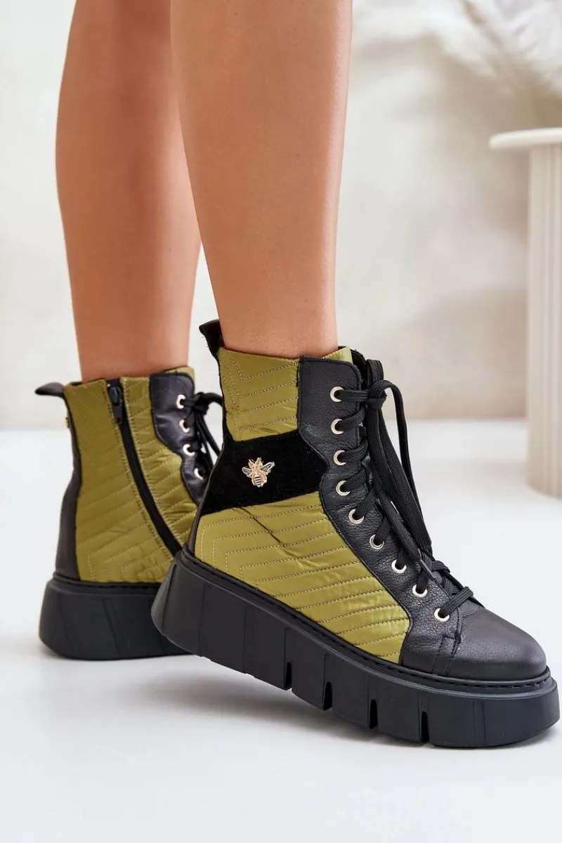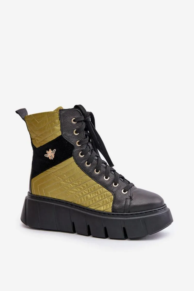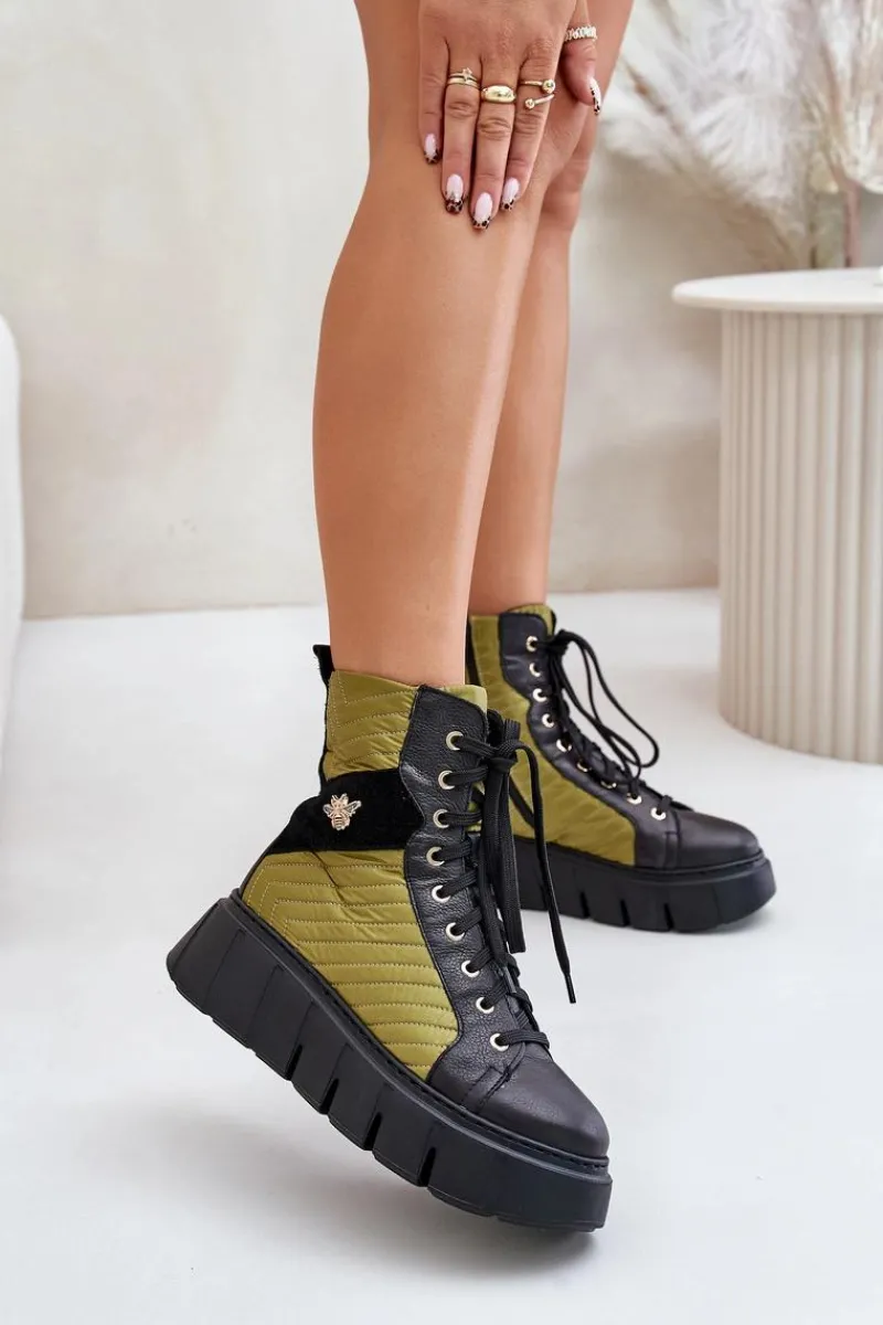 Botki marki Maciejka, wykonane z połączenia wysokiej jakości skóry naturalnej i materiału tekstylnego. Osadzone na solidnej platformie, łączą styl z wygodą. Model ten posiada zarówno zamek, jak i sznurowanie, co zapewnia doskonałe dopasowanie i łatwość zakładania. Wnętrze butów jest ocieplone, co sprawia, że są idealne na chłodniejsze dni. Przy wyborze rozmiaru prosimy sugerować się tabelą rozmiarów.