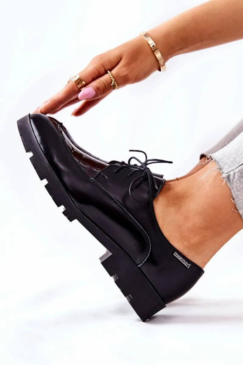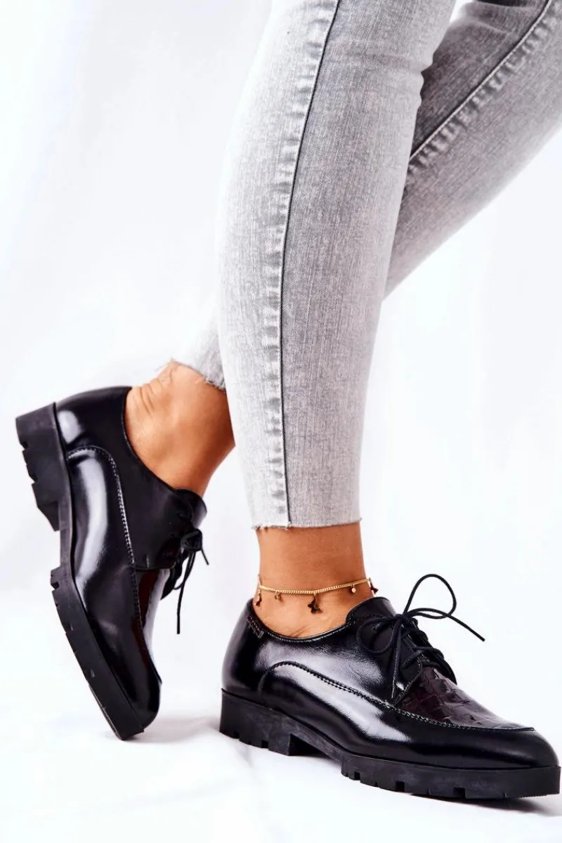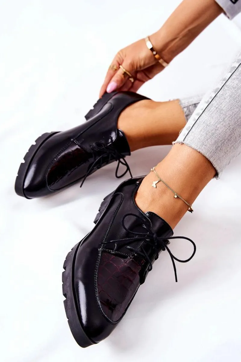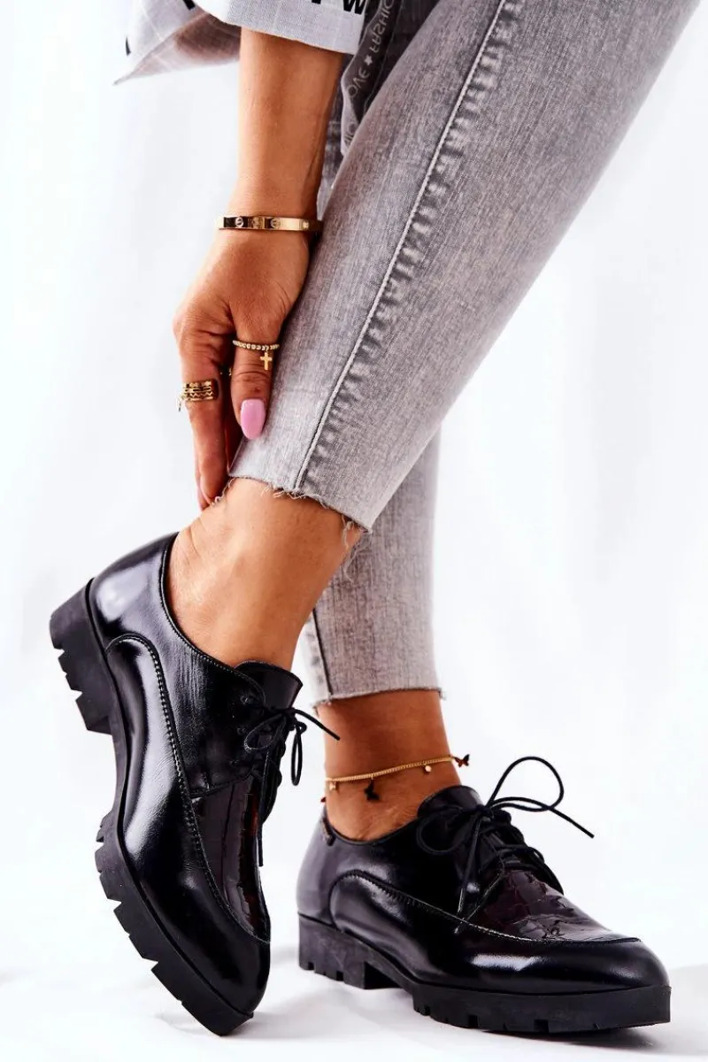 Półbuty zostały wykonane z wysokiej jakości naturalnej skóry, częściowo lakierowanej. Miękka wkładka ze skóry naturalnej to gwarancja komfortu. Wiązanie sprawia, że można dopasować je odpowiednio do tęgości nogi. Niewysoki, masywny obcas zapewnia wygodę. Nosek w szpic sprawi, że noga będzie wyglądać smuklej. Podczas wyboru rozmiaru prosimy sugerować się tabelą rozmiarów.