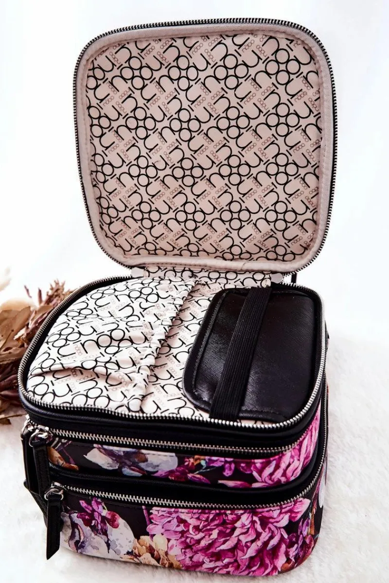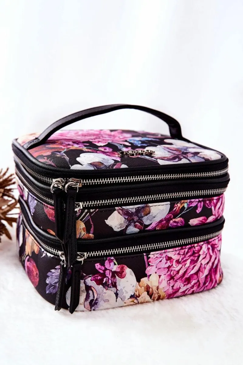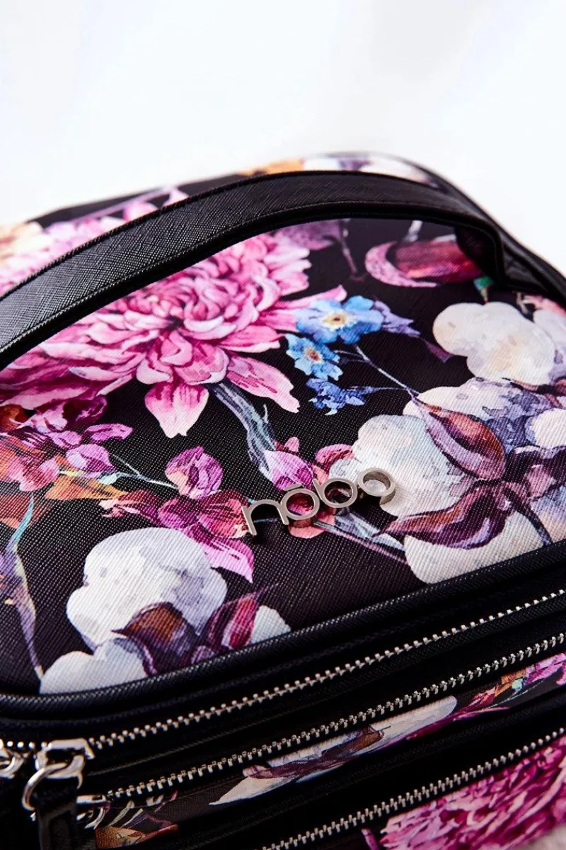 Kosmetyczka została wykonana z ekoskóry w piękny print. Może pełnić także funkcję kuferka. Posiada trzy suwaki, dzięki którym mamy wygodny dostęp do zawartości. W górnej komorze znajduje się otwarta kieszeń z gumką oraz osobna gumka podtrzymująca kosmetyki. W środkowej komorze można luźno umieścić różne, małe przedmioty. Dolna kieszeń jest głębsza od środkowej i również nie posiada kieszonek ani gumek, jak środkowa komora. Całość w środku jest obszyta materiałem w logo marki NOBO.