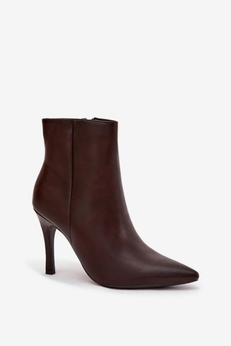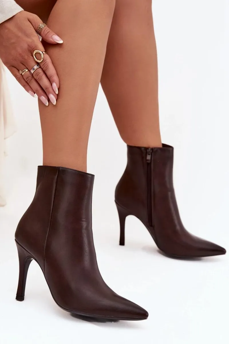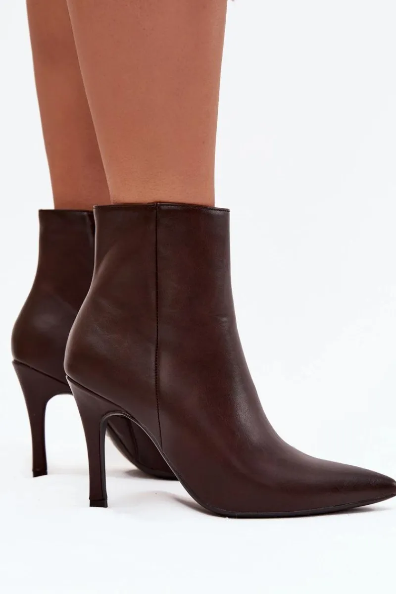 Botki damskie wykonane z eko skóry to elegancka propozycja na chłodniejsze dni. Model zapinany na zamek jest wygodny w użytkowaniu, a ocieplenie kocem obuwniczym zapewnia komfort i ciepło. Szpiczaste noski dodają kobiecego charakteru i subtelnej elegancji. To uniwersalny fason, który doskonale uzupełni zarówno codzienne, jak i bardziej eleganckie stylizacje. Przy wyborze rozmiaru prosimy sugerować się tabelą rozmiarów.