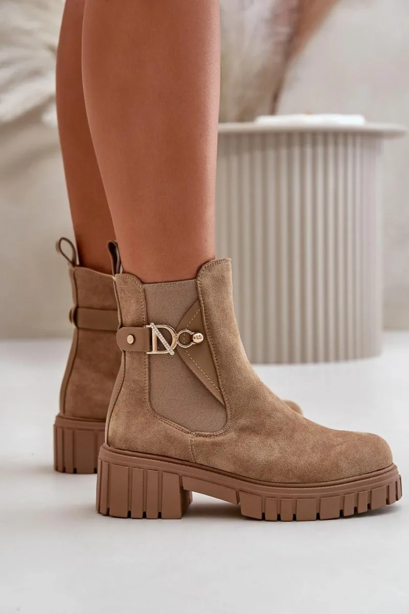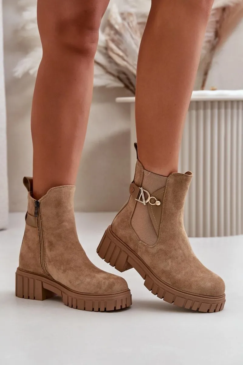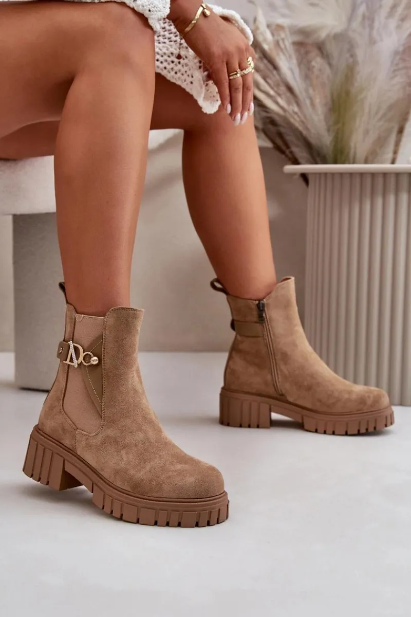 Botki damskie wykonane z miękkiego eko zamszu. Wnętrze ocieplone kocem obuwniczym sprawia, że są one doskonałym rozwiązaniem na chłodne dni. Wyróżniającym się elementem tego modelu jest złoty detal, który dodaje im wyjątkowego uroku i elegancji. Zapinanie na zamek ułatwia zakładanie i zdejmowanie obuwia. Doskonale sprawdzą się w połączeniu z różnymi elementami garderoby, od jeansów po eleganckie sukienki, podkreślając unikalny styl każdej kobiety. Przy wyborze rozmiaru prosimy sugerować się tabelą rozmiarów.