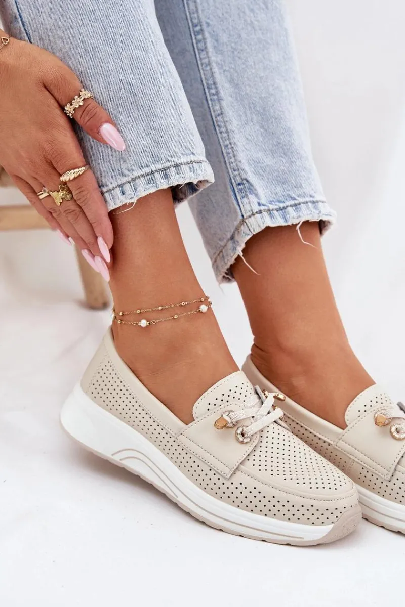 Półbuty damskie wykonane z naturalnej skóry to połączenie elegancji i wygody. Osadzone na platformie, zapewniają stabilność i komfort przez cały dzień. Model posiada gumki imitujące sznurówki z ozdobnymi przypinkami, które nadają oryginalnego charakteru. Zaokrąglone noski zapewniają wygodę, a miękka wkładka dodatkowo dba o komfort stóp. Lekkie i wygodne, te półbuty będą doskonałym wyborem do codziennych stylizacji, łącząc funkcjonalność z modnym wyglądem. Przy wyborze rozmiaru prosimy sugerować się tabelą rozmiarów.