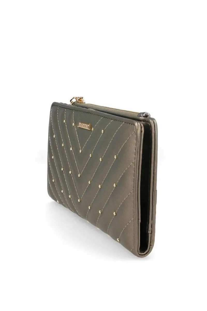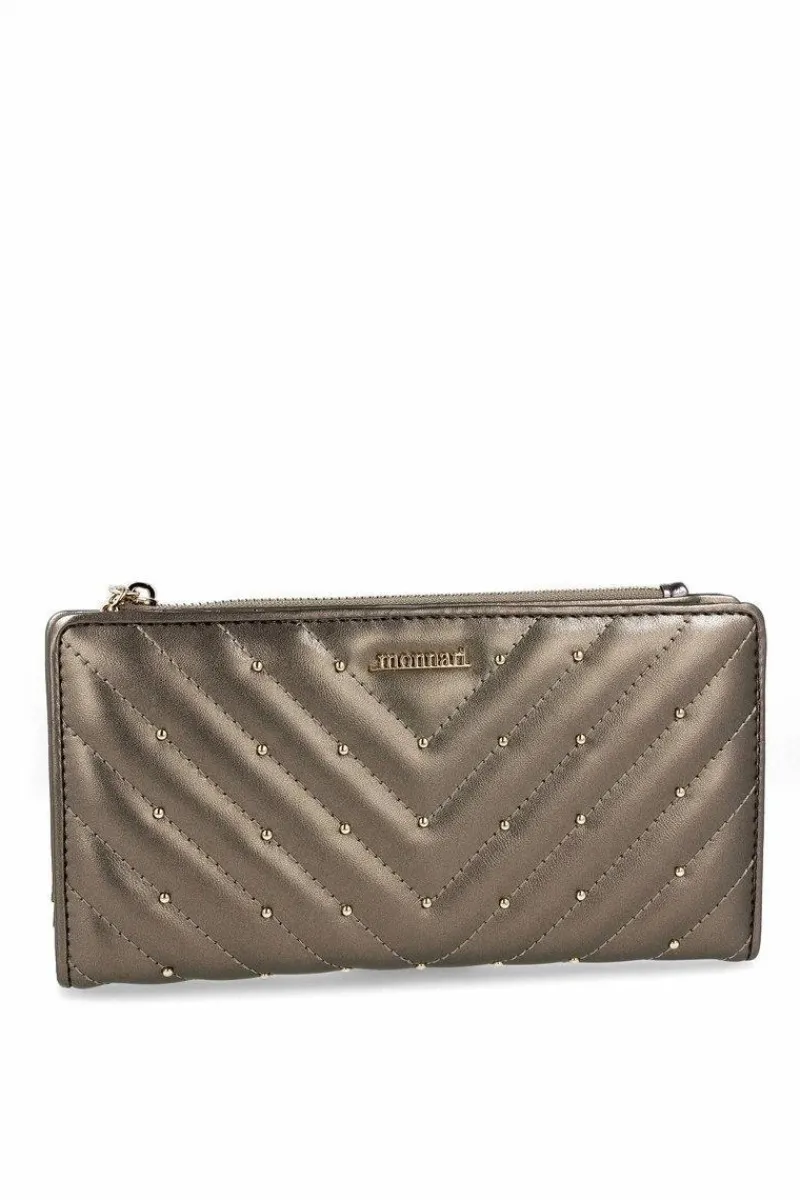 Elegancki damski portfel z pikowaniem, wykonany ze skóry ekologicznej. Posiada szczelną, zamykaną na suwak kieszeń na monety. Portfel jest składany na pół z zatrzaskiem. Posiada 7 kieszonek na karty płatnicze lub lojalnościowe i jedną przeźroczystą, oraz dwie kieszenie na banknoty. Z przodu znajduje się złote logo MONNARI.