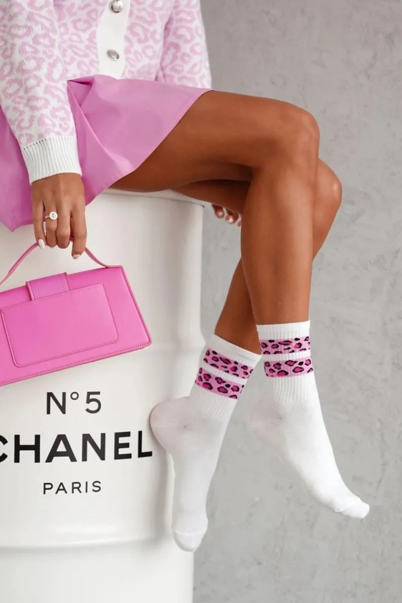 Hot Skarpetki Damskie Dwa Cętkowane Paski Biało-Różowe Skarpetki|Skarpetki