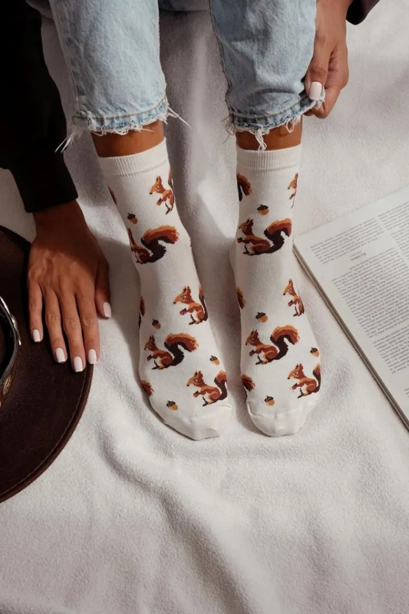 Hot Skarpetki Damskie Wiewiórki I Orzechy Ecru Skarpetki|Skarpetki