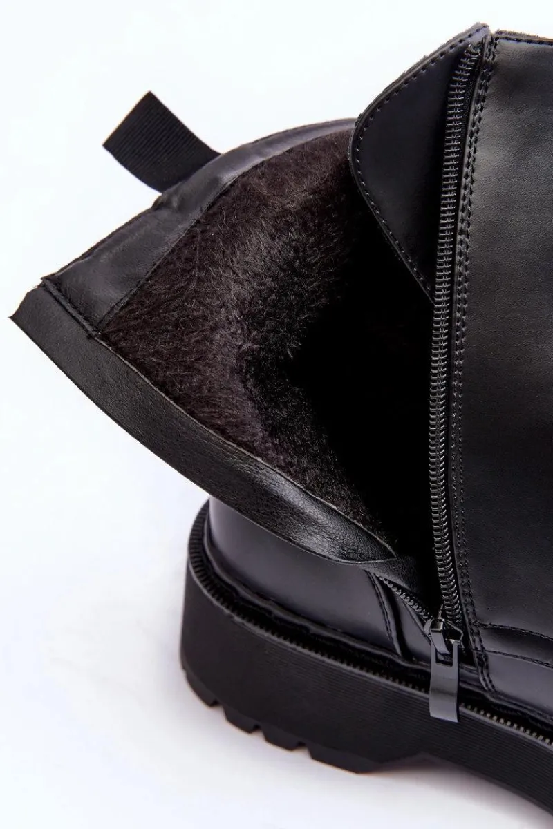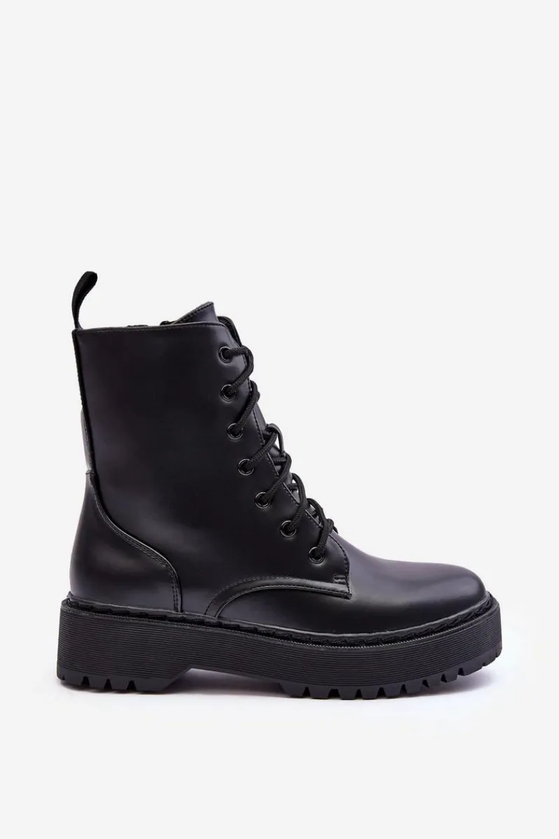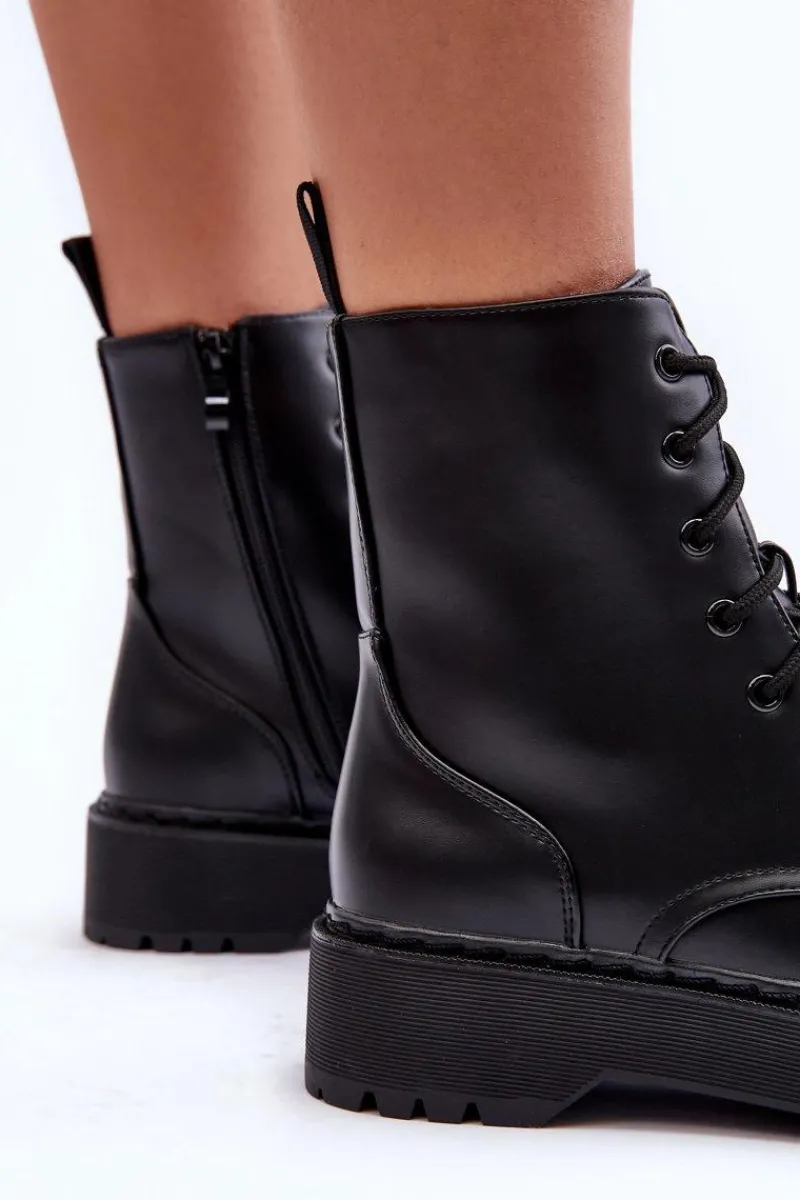 Modne damskie botki zostały wykonane z eko skóry. Płaski obcas oraz platforma zapewnią stabilność na każdym kroku. Zapinane są z boku cholewki na zamek oraz dodatkowo sznurowane. Zapiętek w tym obuwiu jest usztywniany. Ocieplone kocem obuwniczym. Świetny model do jesiennych i zimowych stylizacji! Przy wyborze rozmiaru prosimy sugerować się tabelą rozmiarów.