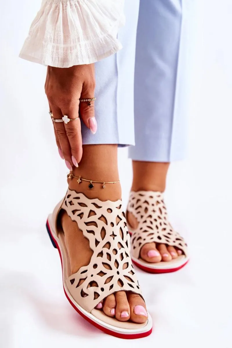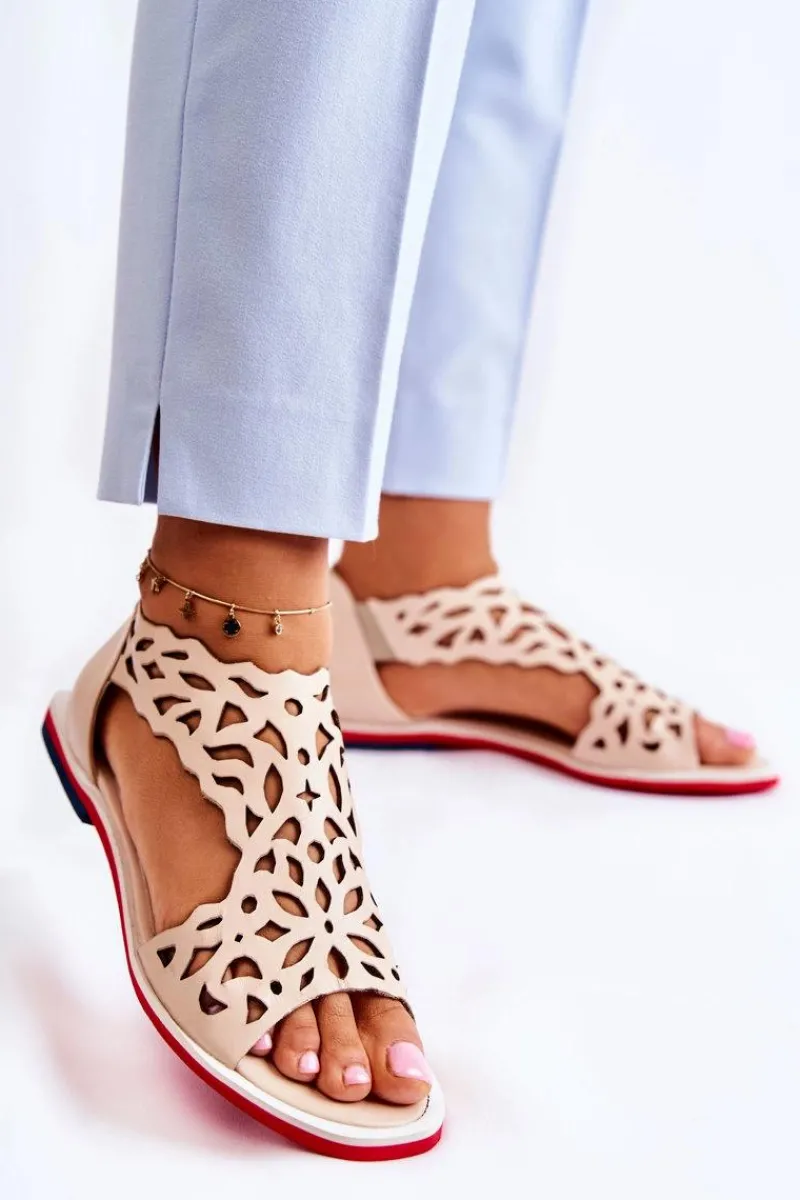 Damskie sandały zostały wykonane z naturalnej skóry w ażurowy wzór. Z boku cholewki posiadają gumkę. Zapiętek usztywniany z suwakiem. Buty są osadzone na płaskim obcasie. Sandały posiadają odkryty nosek. Miękka wkładka została także wykonana z naturalnej skóry. Lekki i przewiewny fason świetnie sprawdzi się w upalne dni. Koniecznie powinnaś je mieć! Przy wyborze rozmiaru prosimy sugerować się tabelą rozmiarów.