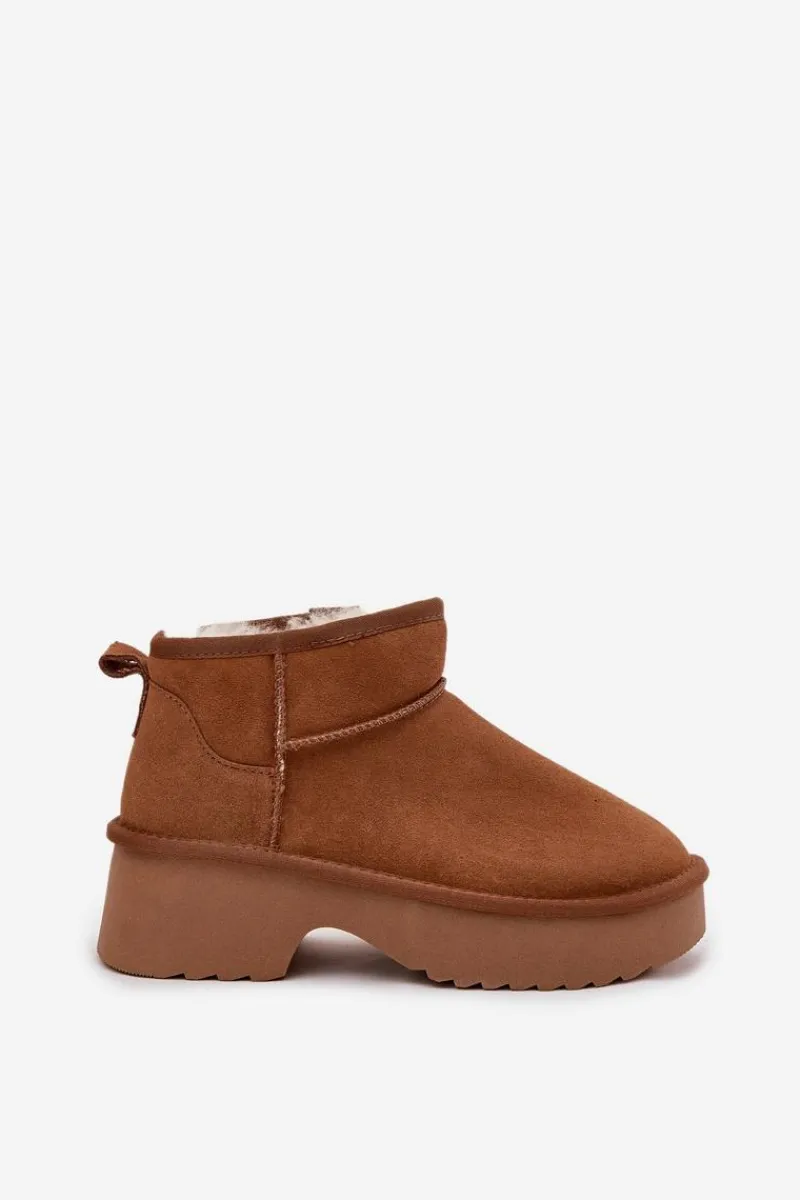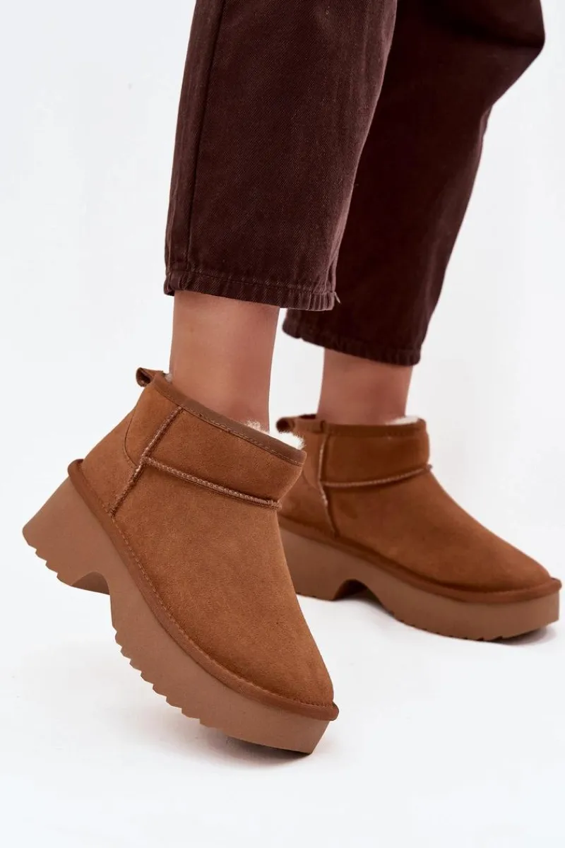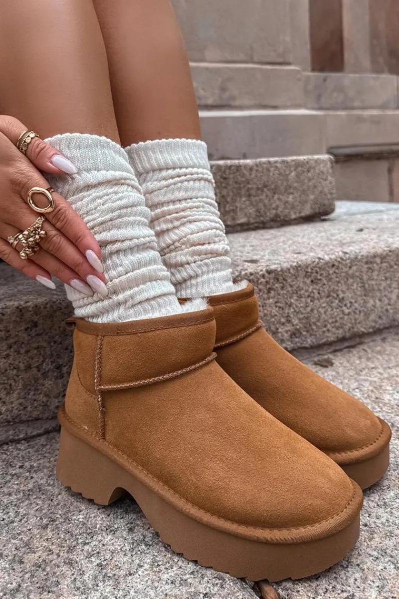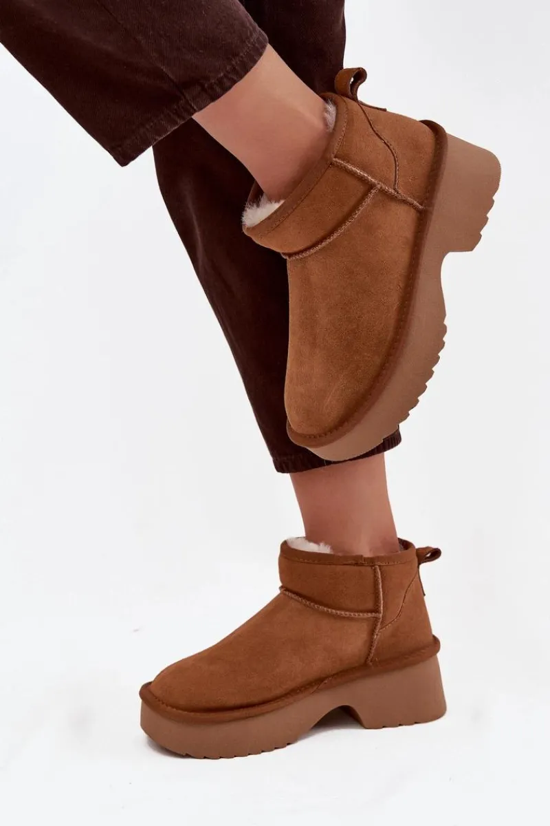 Śniegowce damskie wykonane z naturalnego zamszu to stylowa propozycja na zimowe dni. Osadzone na platformie, zapewniają stabilność i wygodę podczas chodzenia, jednocześnie skutecznie izolując od chłodu. Wnętrze butów zostało ocieplone futerkiem, które gwarantuje ciepło i komfort w mroźne dni. Modny fason sprawia, że śniegowce doskonale wpisują się w aktualne trendy. To idealny wybór dla kobiet, które cenią styl i wygodę w zimowych stylizacjach.