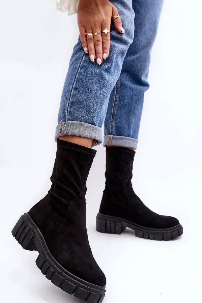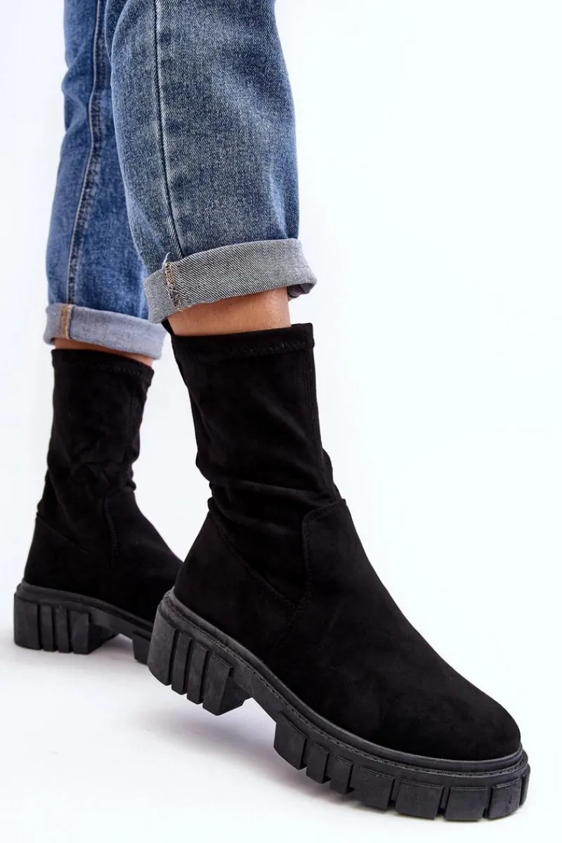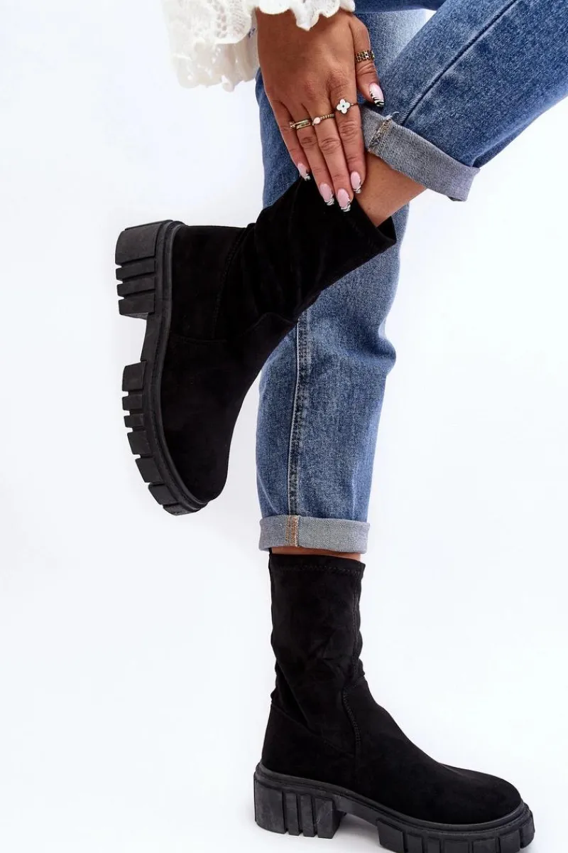 Wsuwane botki damskie wykonane z eko zamszu. Osadzone na masywnym, płaskim obcasie i platformie. Nieocieplone. Miękka wkładka zapewni komfort podczas użytkowania. Zapiętek w tym obuwiu jest usztywniany. Model ten dopasujesz do wielu jesiennych stylizacji! Przy wyborze rozmiaru prosimy sugerować się tabelą rozmiarów.
