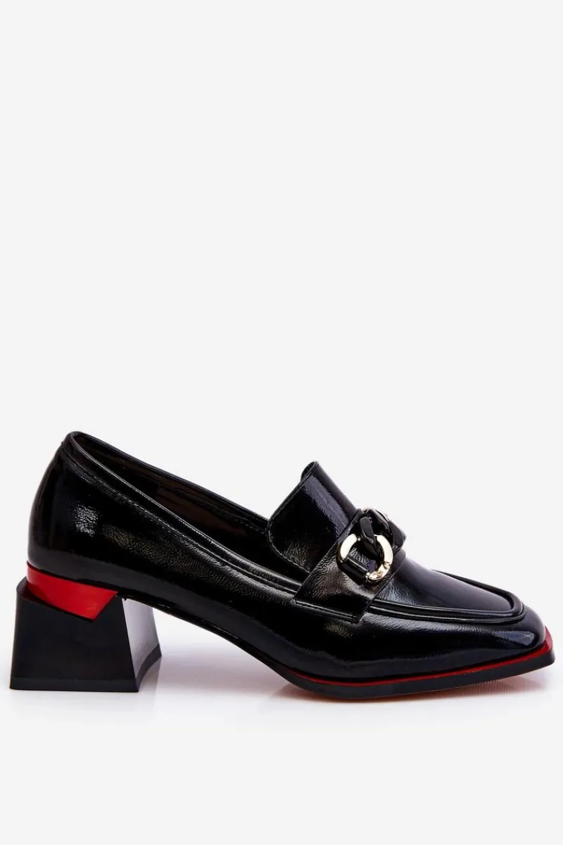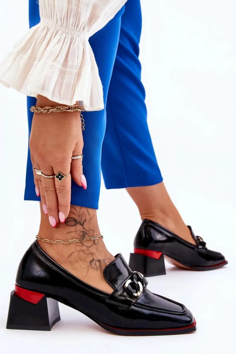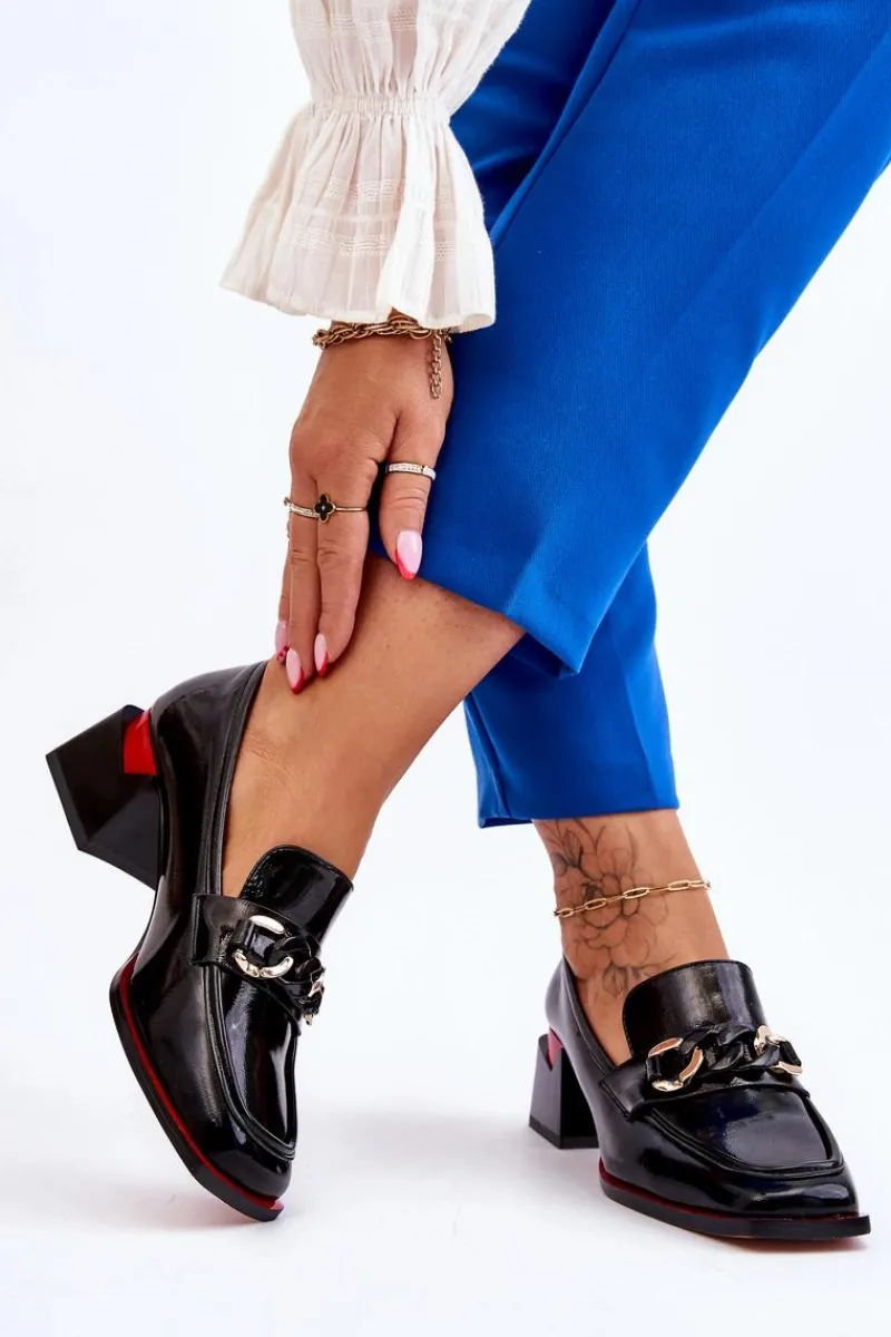 Czółenka na niskim obcasie w postaci klocka. Zostały ozdobione z przodu cholewki łańcuchem z tworzywa sztucznego. Wykonane z eko skóry. Miękka wkładka zapewni wygodę na każdym kroku. Model ten posiada kwadratowy nosek. Dodatkowo zapiętek jest usztywniany. Te czółenka świetnie sprawdzą się z eleganckimi spodniami czy dłuższymi, plisowanymi spódnicami. Przy wyborze rozmiaru prosimy sugerować się tabelą rozmiarów.