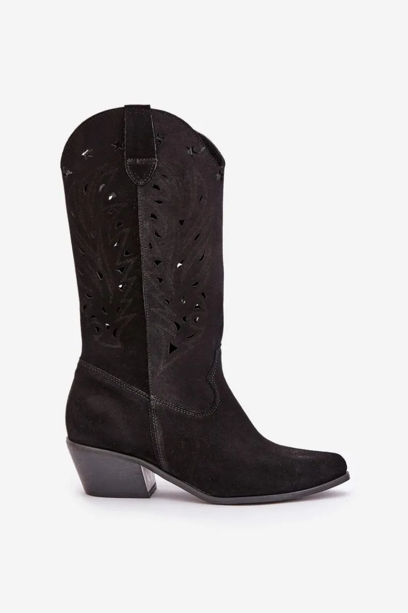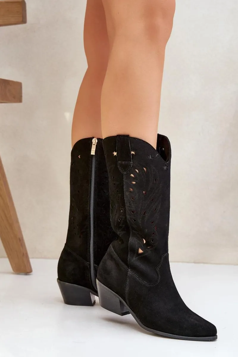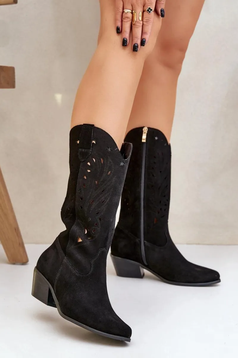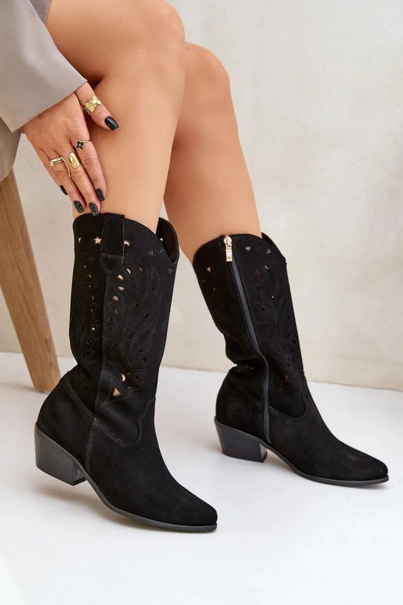 Kozaki do połowy łydki z ażurową cholewką. Zapinane na zamek. Wykonane z wysokiej jakości naturalnego zamszu. Noski w szpic. Te kozaki doskonale sprawdzą się w wielu codziennych stylizacjach. Miękka, skórzana wkładka gwarantuje komfort podczas noszenia. Ażurowe kozaki to doskonały wybór do różnych wiosennych stylizacji! Przy wyborze rozmiaru prosimy sugerować się tabelą rozmiarów.