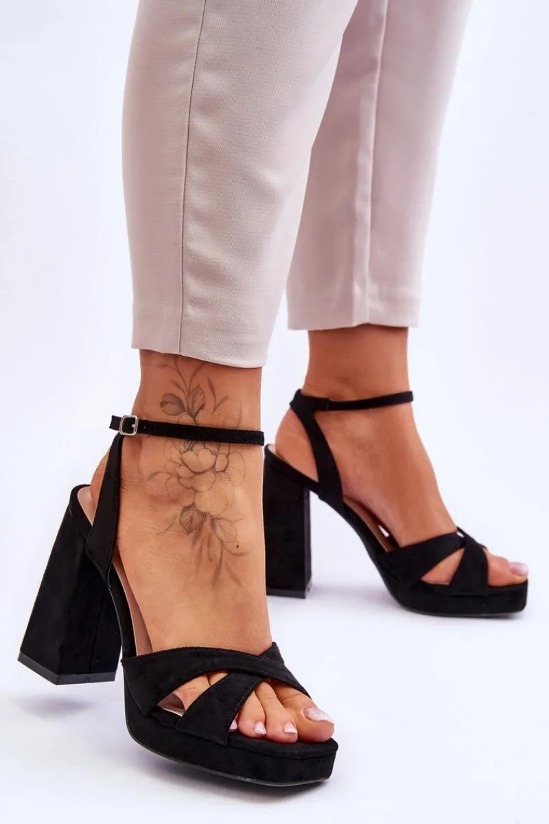 Klasyczne sandałki zostały wykonane z miłego w dotyku eko zamszu. Model ten posiada zapinanie na regulowany pasek ze sprzączką. Sandałki osadzono na platformie oraz kwadratowym obcasie. Wkładka w tych butach jest wykonana z eko skóry. Sandałki posiadają odkryty, kwadratowy nosek. Przy wyborze rozmiaru prosimy sugerować się tabelą rozmiarów.